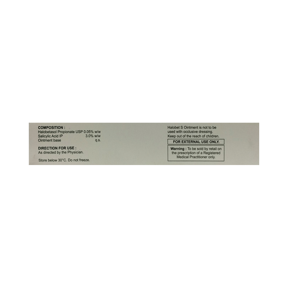 Halobet S Ointment is a combination medicine that is used to treat eczema and psoriasis. It provides relief from redness, itching and swelling. It helps in softening the skin. Halobet S Ointment should be used in the dose and duration as advised by your doctor. Wash your hands before using this medicine. It is advised to check the label for directions before use. It is for external use only.Do not use this medicine more than the recommended dose. Inform your doctor if you have known allergies from this medicine. The common side effects of this medicine include thinning of the skin, dry skin, burning, irritation, itchiness, and redness at the application site.If these side effects or any other symptoms which you think are because of this medicine persist for a longer duration, please consult your doctor. Inform your doctor if you are pregnant or are suffering from any other disease. This medicine is safe to use in breastfeeding mothers.