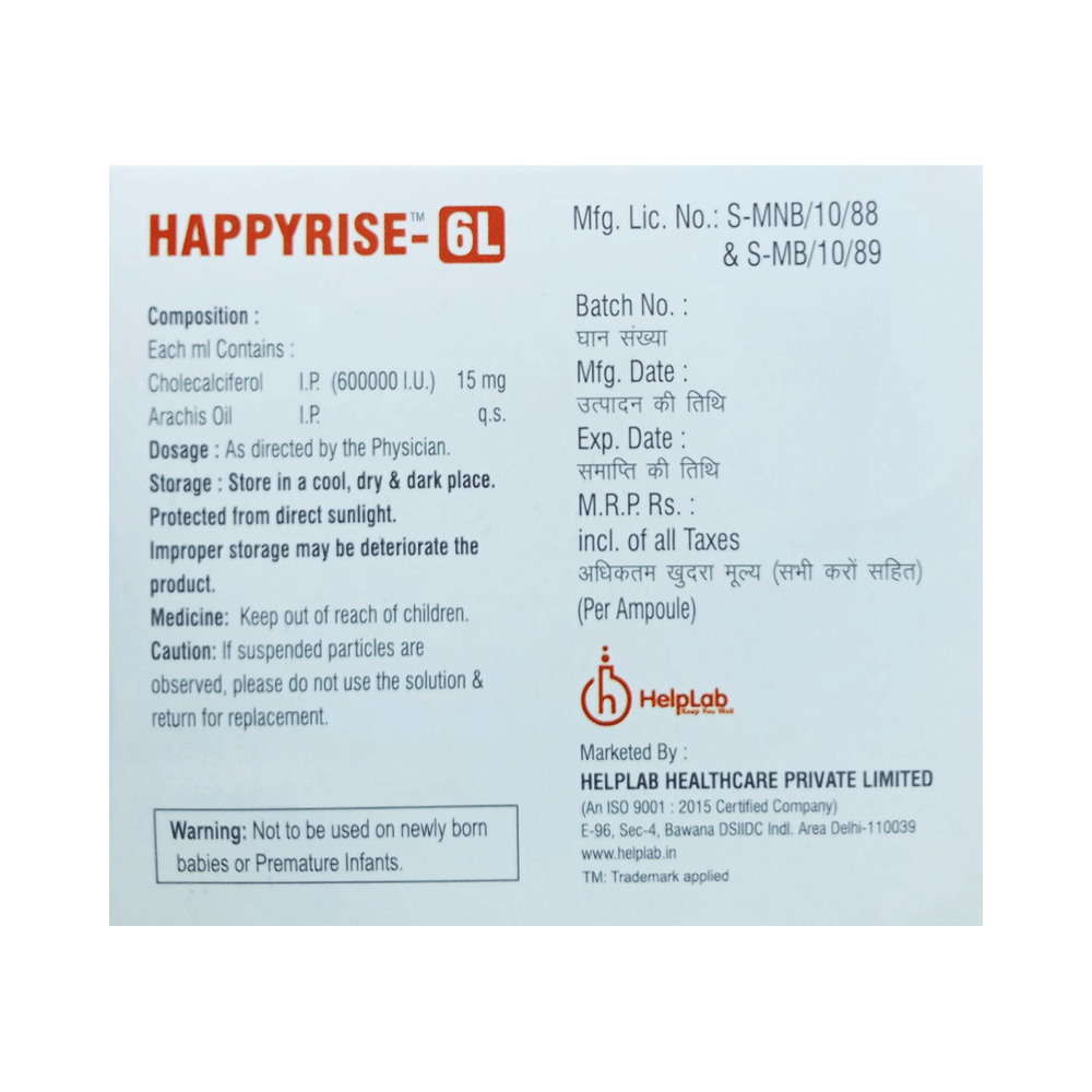 Happyrise 6L Injection is a form of vitamin D. It raises vitamin D levels in your blood. This, in turn, increases calcium levels in your blood by helping you absorb more calcium from food. This helps maintain overall vitamin D levels in the body.