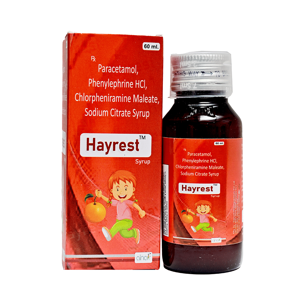 Hayrest Syrup is a combination of four medicines: Chlorpheniramine Maleate, Phenylephrine, Paracetamol, and Sodium Citrate, which relieves common cold symptoms. Chlorpheniramine is an antiallergic that relieves allergy symptoms like runny nose, watery eyes, and sneezing. Phenylephrine is a decongestant that narrows the small blood vessels providing relief from congestion or stuffiness in the nose. Paracetamol is an analgesic (pain reliever) and an antipyretic (fever reducer). It blocks the release of certain chemical messengers in the brain that are responsible for pain and fever. Sodium citrate is a mucolytic that thins and loosens mucus (phlegm), making it easier to cough out.
