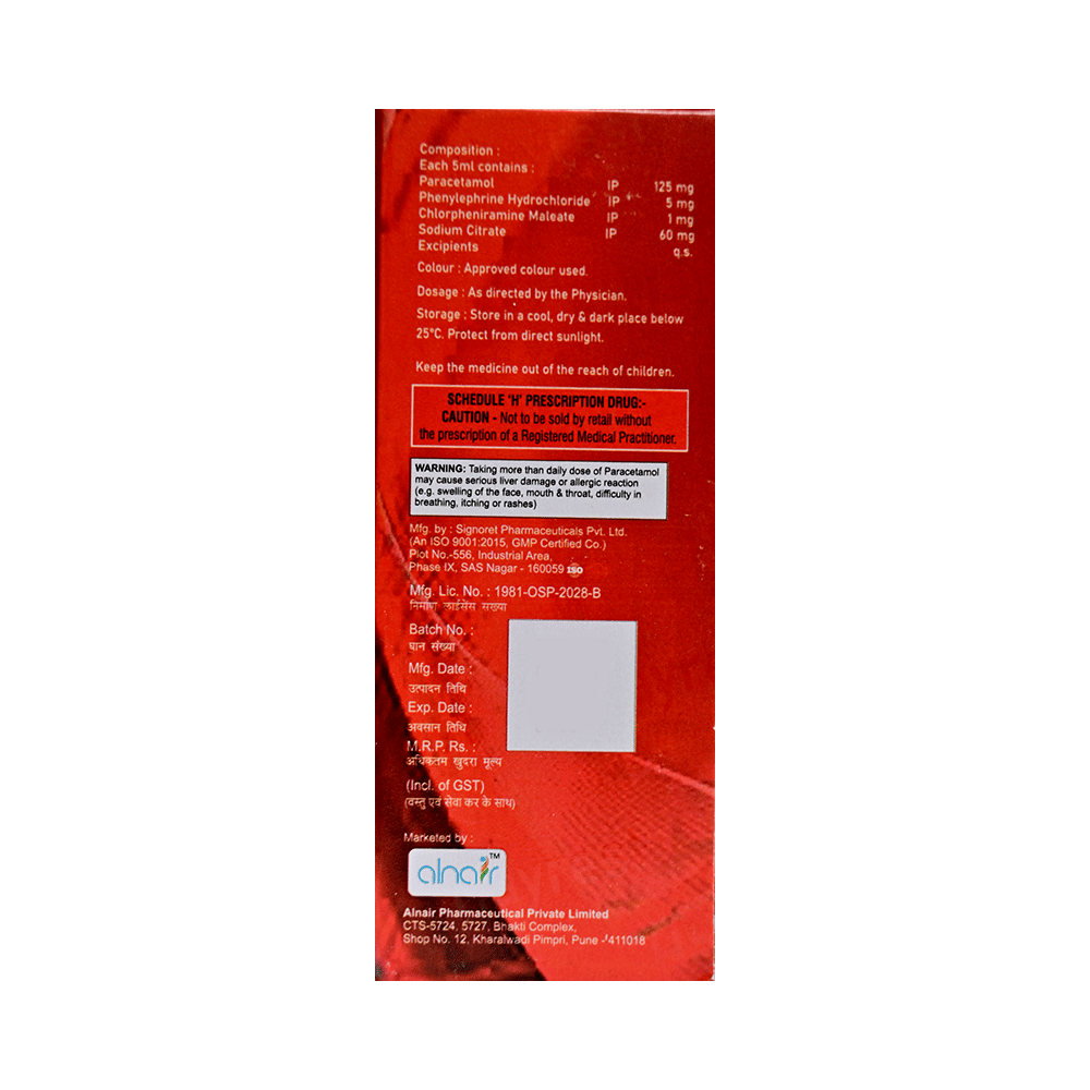 Salt Composition: Chlorpheniramine Maleate (1mg/5ml) + Phenylephrine (5mg/5ml) + Paracetamol (125mg/5ml) + Sodium Citrate (60mg/5ml)