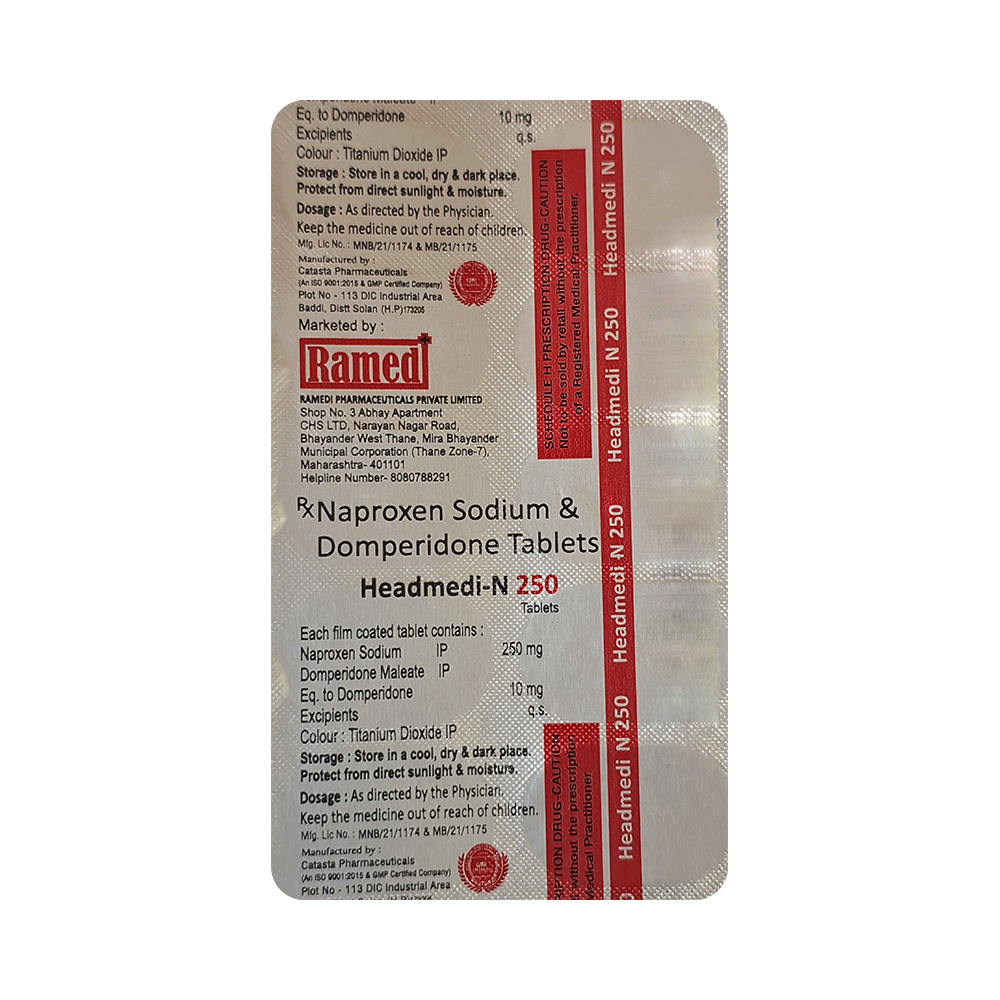 Headmedi-N 250 Tablet is a combination of two medicines: naproxen and domperidone. Naproxen is a non-steroidal anti-inflammatory drug (NSAID) that works by blocking the release of certain chemical messengers that cause pain due to migraine. Domperidone works on the region in the brain that controls vomiting associated with migraine. Together, they provide relief from migraine symptoms.