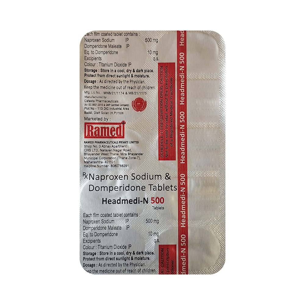 Headmedi-N 500 Tablet is a medicine used in the prevention of migraines. It inhibits the release of certain chemical messengers that cause pain, inflammation, and fever. It also blocks the signals in the brain that cause nausea and vomiting associated with migraines. Headmedi-N 500 Tablet may be prescribed alone or in combination with another medicine. It can be taken with or without food. The dose and duration will depend on the severity of your condition and how well it helps your symptoms. Use it regularly and do not discontinue it until the doctor tells you it is right to stop.Using Headmedi-N 500 Tablet may cause common side effects such as headaches, ringing in the ears, dizziness, tiredness, rashes, and vision changes. If you experience such side effects that do not go away or get worse, you should let your doctor know. Your doctor may be able to suggest ways of preventing or reducing the symptoms.In general, you should try to use the smallest amount necessary to control your symptoms. Before using the medicine, you should tell your doctor if you have any other illnesses or disorders. It may also affect, or be affected by, some other medicines you are using, so let your doctor know all the other medicines you are taking. Pregnant and breastfeeding women should consult their doctors first before using the medicine.