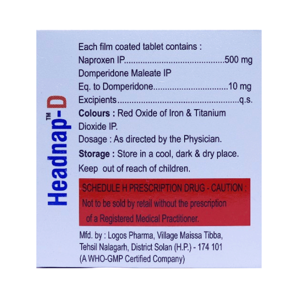 Headnap-D Tablet is a combination of two medicines: naproxen and domperidone. Naproxen is a non-steroidal anti-inflammatory drug (NSAID) that works by blocking the release of certain chemical messengers that cause pain due to migraine. Domperidone works on the region in the brain that controls vomiting associated with migraine. Together, they provide relief from migraine symptoms.