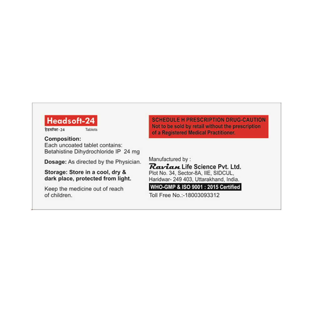 In Treatment of Meniere's diseaseHeadsoft 24 Tablet improves blood flow to the inner ear which reduces the pressure of excess fluid there. It is this pressure that is thought to cause the symptoms of nausea, vertigo (dizziness), tinnitus (ringing in your ears), and hearing loss in people who have Ménière’s disease. This medicine makes the symptoms milder and reduces the number of times you get the symptoms. It will be more effective if you take this medicine regularly as prescribed so try not to miss doses. It may take a couple of weeks before you notice any improvements but keep taking it, even if you do feel better until your doctor advises it is safe to stop.