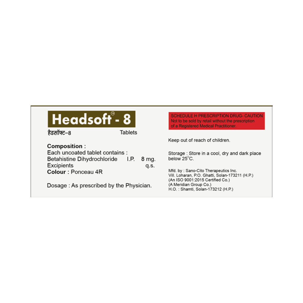 Headsoft 8 Tablet is used to prevent and treat a disorder of the inner ear known as Ménière’s disease. The symptoms include dizziness (vertigo), ringing in the ears (tinnitus), and loss of hearing, probably caused by fluid in the ear. This medicine helps relieve the symptoms by reducing the amount of fluid. Headsoft 8 Tablet should be swallowed whole with water and taken at the same time(s) each day to get the most benefit. Your doctor will decide what is the correct dose to relieve your symptoms and how often you need to take it. You may need to take this medicine for several months and you should take it for as long as prescribed by your doctor, even if you start feeling better. The most common side effects include headache, feeling sick, and indigestion (dyspepsia). You may also get stomach pain and bloating. Taking the medicine with food can help reduce stomach problems.  Before taking this medicine, you should talk to your doctor if you have a stomach ulcer, asthma, or high or low blood pressure. You must also tell him/her what other medicines you are taking, to make sure you are safe. Also speak to your doctor if you are pregnant, trying to become pregnant, or breastfeeding.