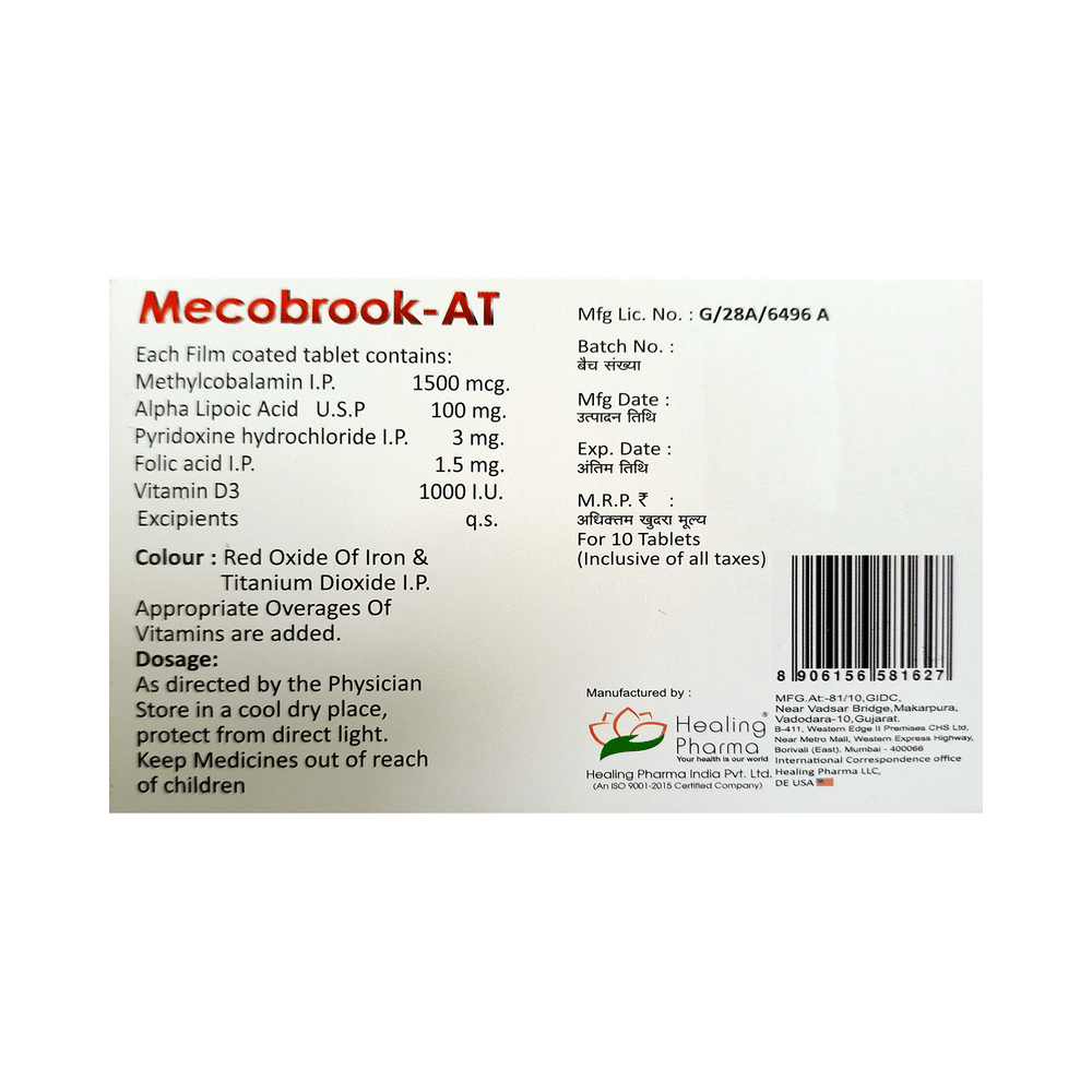 Healing Pharma Mecobrook AT Tablet is a prescription medicine which has a combination of medicine that is used in the treatment of nutritional deficiencies. It contains nutritional supplements that are important for the proper growth and development of the body. Healing Pharma Mecobrook AT Tablet may be taken with or without food. It should be used in the dose and duration as prescribed by your doctor. It is advised to take this medicine at a fixed time.This medicine should not be taken more than the recommended dose. It is usually a safe medicine, however some people may experience diarrhea, nausea, vomiting, and constipation. If you experience any of these side effects which do not resolve on their own or get worse, let your doctor know.Before taking this medicine, tell your doctor if you have any other health conditions. Inform your doctor if you are taking any other medicines or if you are pregnant or breastfeeding. It is advised to avoid alcohol intake while taking this medicine.