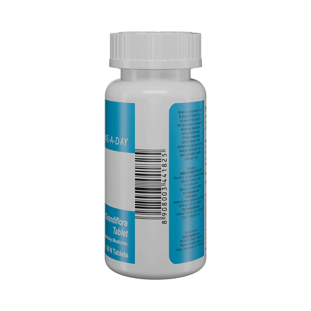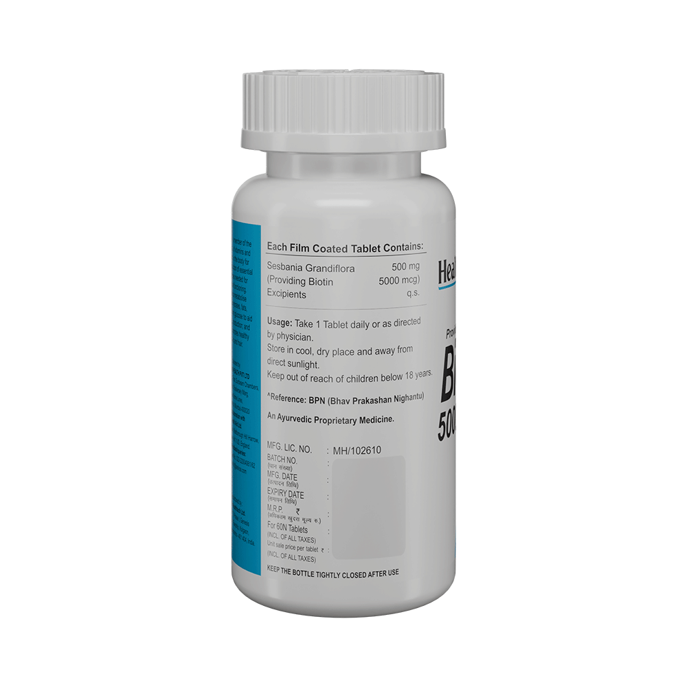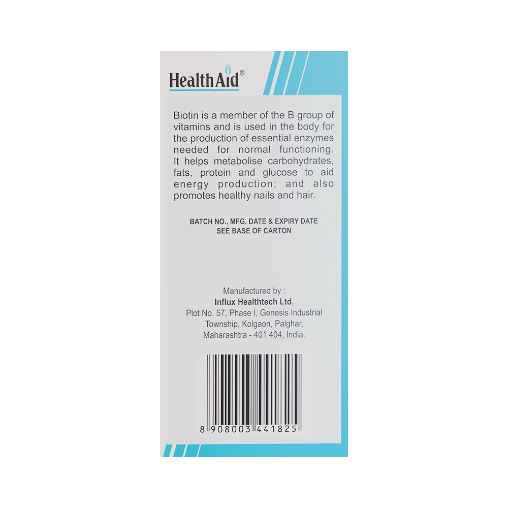 HealthAid Biotin 5000 µg Tablet is a form of vitamin B that provides essential nutrients. It is used to treat nutritional deficiencies caused by a lack of vitamin B7. It helps in breaking down carbohydrates, fats, and other substances in the body. HealthAid Biotin 5000 µg Tablet is best taken with food. Take it in the dose and duration as directed by your doctor. The medicine should not be stopped without the advice of the doctor. It is to be swallowed as a whole and not to be crushed or chewed. Take it regularly and at the same time each day for maximum benefits.This medicine is generally safe with little or no side effects. However, it may cause stomach upset and diarrhea in some people. If these symptoms persist for a longer duration, let your doctor know. They may be able to suggest ways to reduce or treat them.Before taking this medicine, let your doctor know if you have any preexisting medical conditions. To make sure it is safe for you, let your doctor also know about all the other medicines you are taking.