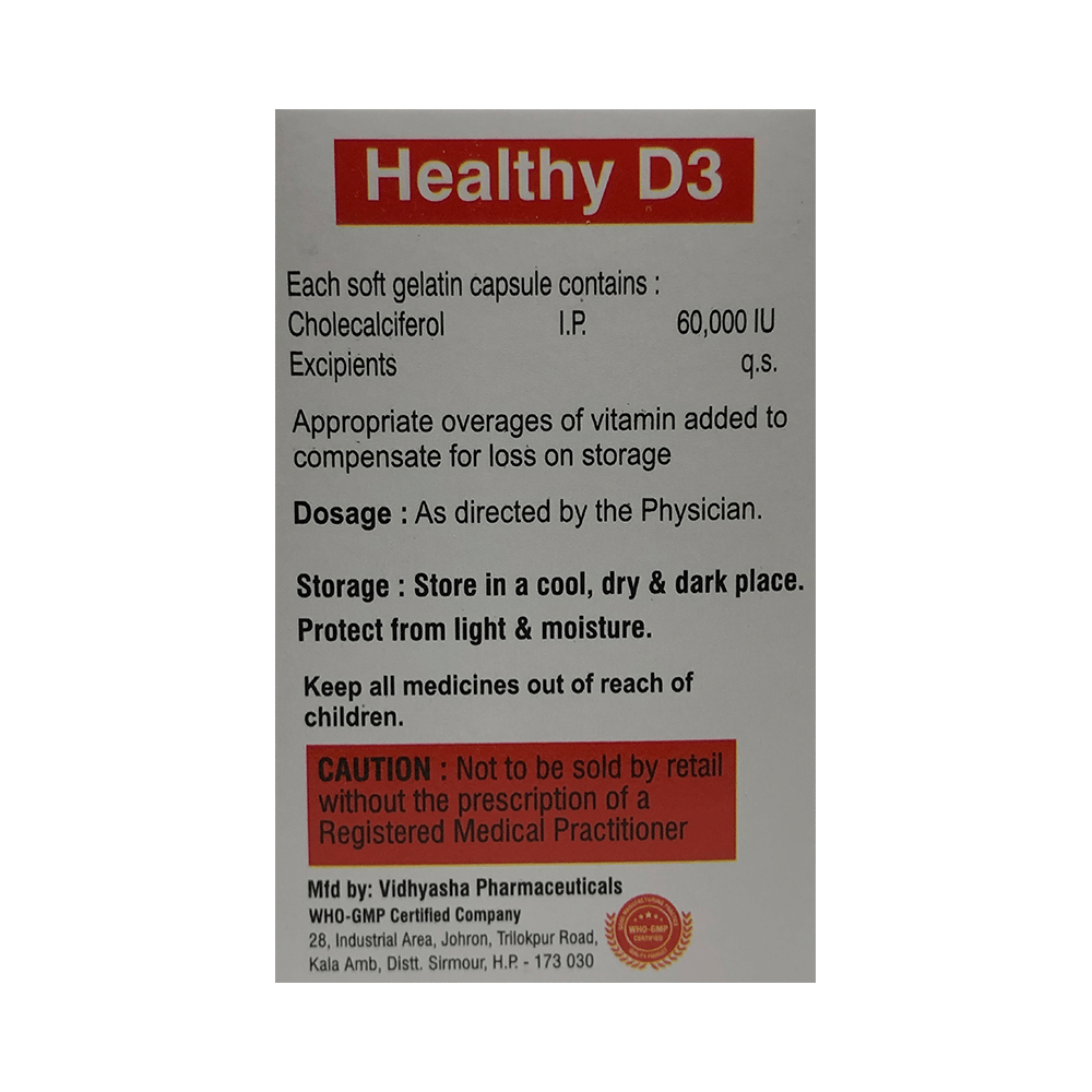 Take this medicine in the dose and duration as advised by your doctor. Swallow it as a whole. Do not chew, crush or break it. Healthy D3 Softgel Capsule is to be taken with food.