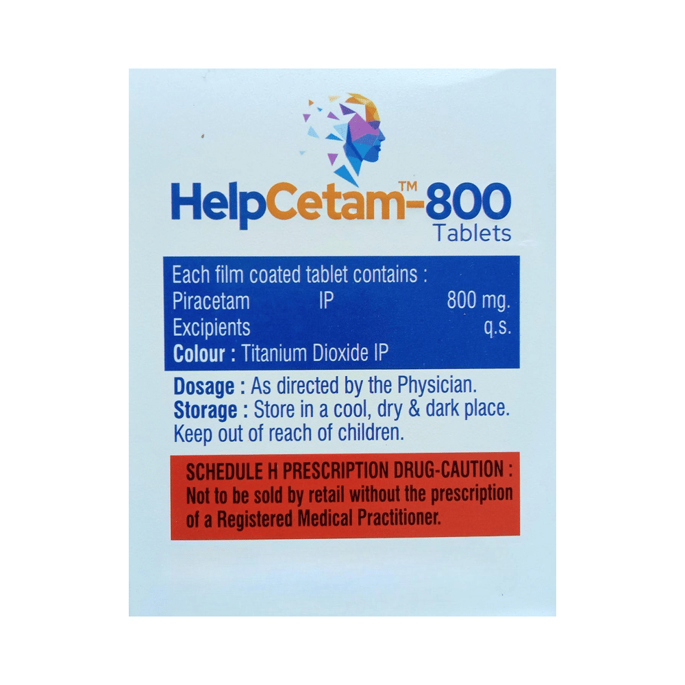 Helpcetam 800 Tablet is used in the treatment of memory loss in Alzheimer's disease. It can also be used to treat age-related and post-traumatic memory loss. It works by improving communication between the nerve cells and protects the brain. Helpcetam 800 Tablet is sometimes used to help manage sickle cell disease. It can reduce the number of painful episodes called vaso-occlusive crises by improving blood flow and preventing blood cells from sticking together.Helpcetam 800 Tablet should be taken by mouth with or without food. It is advisable to take this medicine at the same time each day to maintain a consistent level in the blood. Do not skip any doses and finish the full course of treatment even if you feel better. This medication mustn't be stopped suddenly, as it may result in twitching or jerking movements, and even relapse of the disease may occur.Some common side effects of this medicine include nervousness and abnormality of voluntary movements. It may also cause dizziness and sleepiness, so do not drive or do anything that requires mental focus. This medicine may cause weight gain; therefore, you should have a balanced diet and exercise regularly.This medicine can affect platelet aggregation, so inform your doctor if you have bleeding problems or if you are on medications that help make blood thin. Pregnant and breastfeeding women should consult their doctors before taking this medicine.