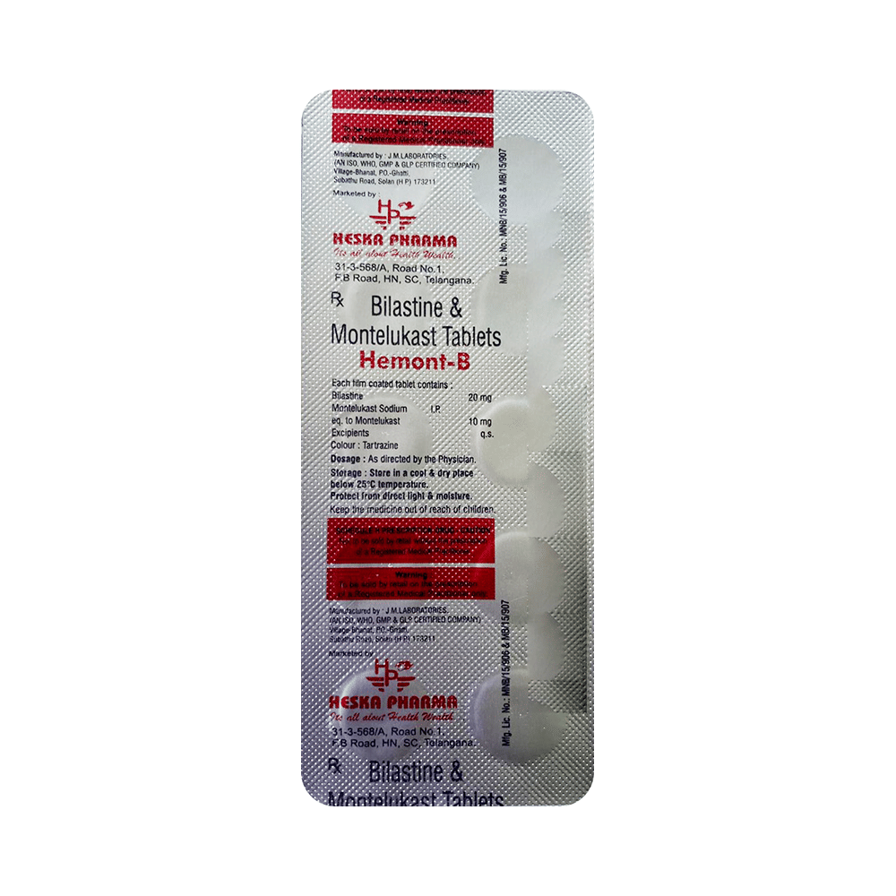 Hemont-B Tablet is a combination of two medicines: bilastine and montelukast. Bilastine is an antiallergic medication. It treats allergy symptoms such as itching, swelling, and rashes by blocking the effects of a chemical messenger (histamine) in the body. Montelukast works by blocking the action of leukotriene, a chemical messenger. This reduces inflammation in the airways to relieve symptoms of allergies.