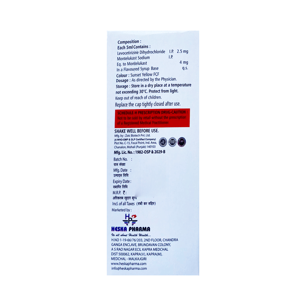 Salt Composition: Levocetirizine (2.5mg/5ml) + Montelukast (4mg/5ml)