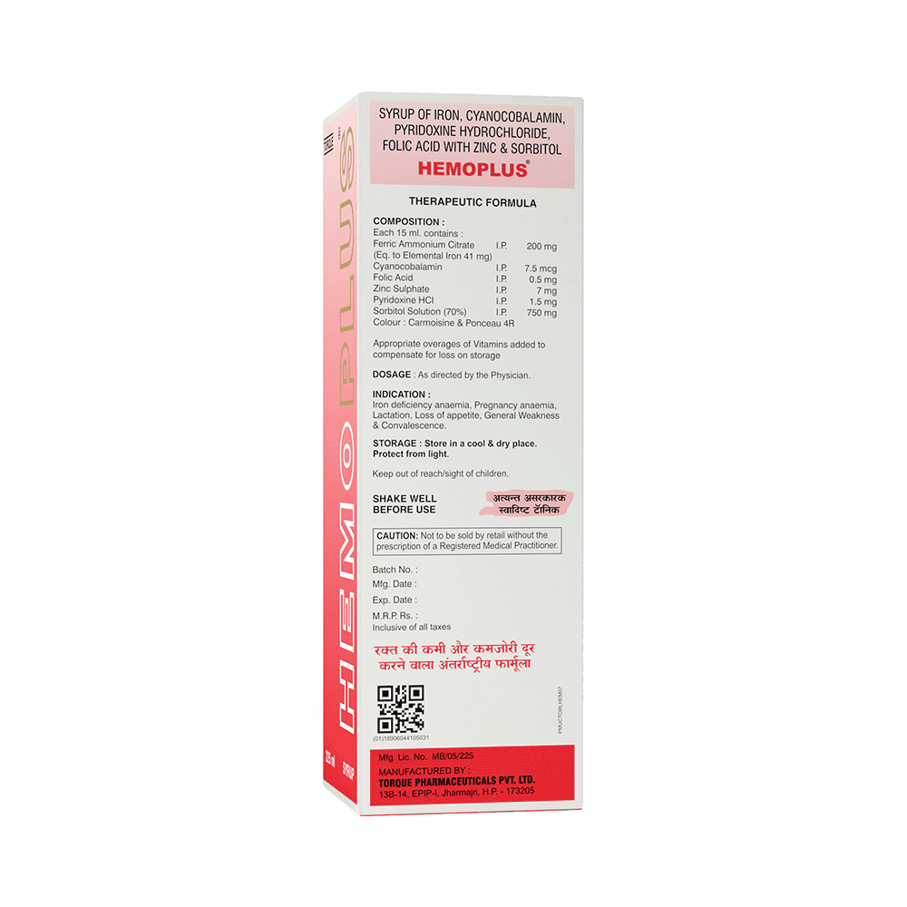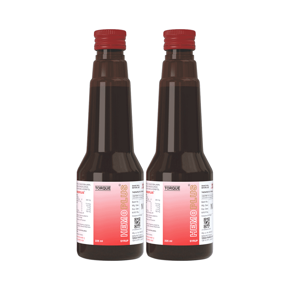 In Treatment of Nutritional deficienciesHemoplus Syrup (225ml Each) is a nutritional supplement consisting of vitamins and minerals. It helps the body perform vital functions, like strengthening the immune system, forming red blood cells, absorbing iron, safeguarding against cell damage and toxic substances, and improving the metabolism in nutrition-deficient patients. It may be prescribed with other medicines for the management of various chronic conditions like cardiovascular disorders, chronic inflammatory conditions, and to help in the proper functioning of the nervous system.