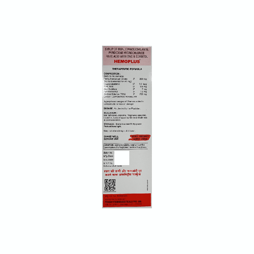 Hemoplus Syrup (225ml Each) is a combination of vitamins and minerals. Iron is a vital mineral that is necessary for the formation of hemoglobin, the protein in red blood cells that carries oxygen from the lungs to the rest of the body. Cyanocobalamin is essential for the formation of red blood cells and the proper functioning of the nervous system. Folic acid is important for DNA synthesis, cell division, and the formation of red blood cells. Zinc is needed for the body's immune system to work properly. It plays a role in growth, wound healing, and maintaining gut health. Zinc is also required for the senses of taste and smell. Pyridoxine hydrochloride treats and prevents the deficiency of vitamin B6 and improves the functioning of the nervous and immune systems. Additionally, Sorbitol has mild laxative properties, which can help promote bowel movements.