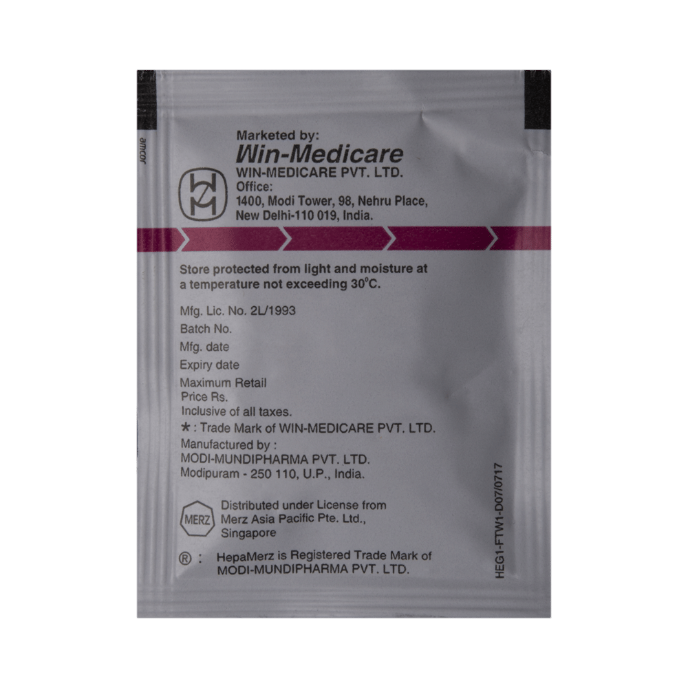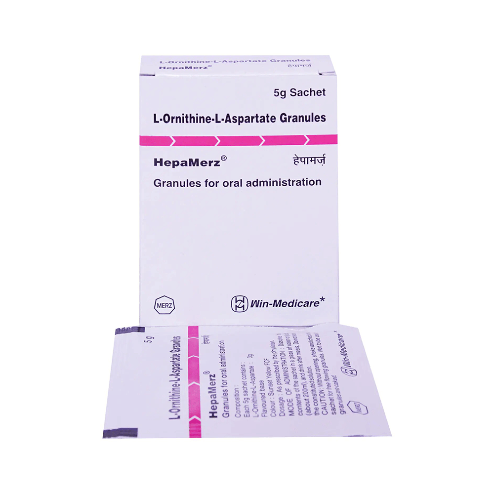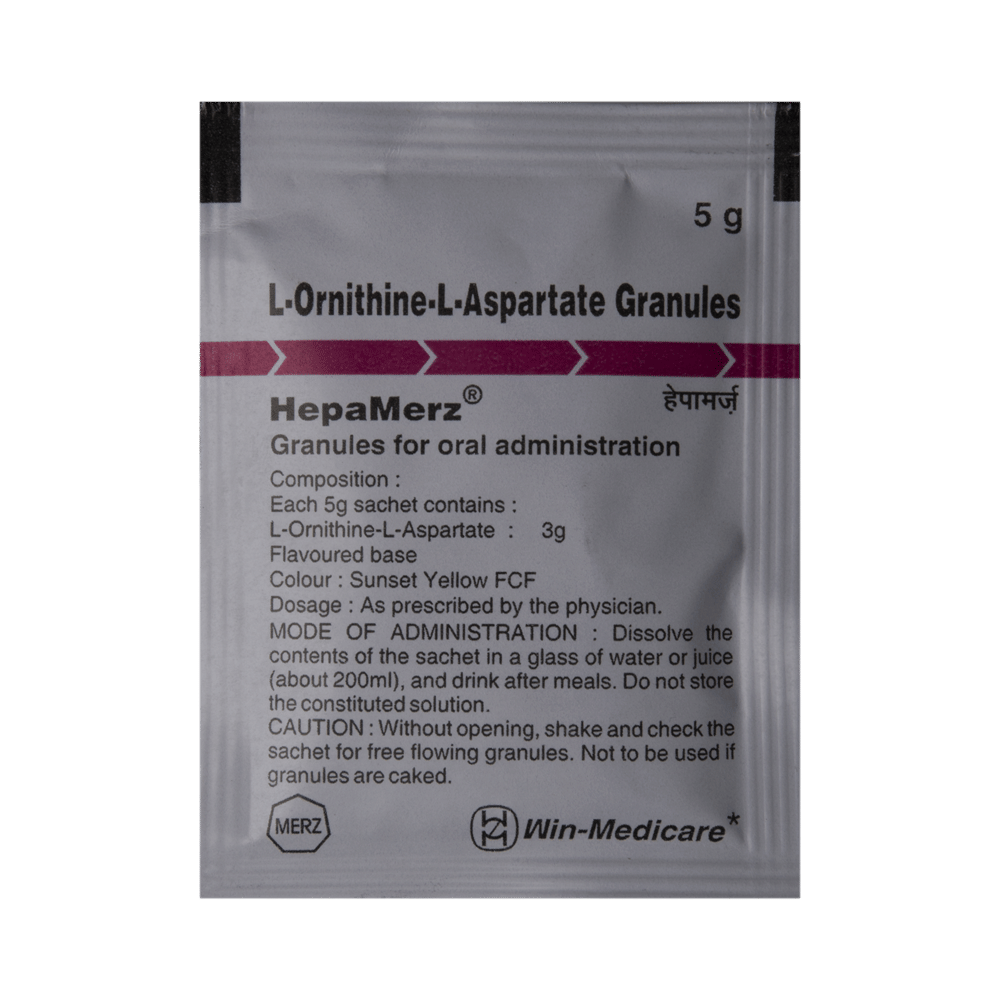 Hepamerz Granules is used in the treatment of liver disease. It protects the liver from harmful chemical substances and improves the functioning of the liver. Hepamerz Granules must be administered under the supervision of healthcare professionals. The course of the treatment should be completed for better results.This medicine is well tolerated with little or no side effects. However, if you experience any symptoms which you think are due to the medicine, inform your doctor. If any kind of allergic reaction (severe rashes, difficulty in swallowing, shortness of breath, swelling, etc.) occurs, you must call for immediate medical help.Inform your doctor before taking the medicine if you have any other medical conditions or are taking any other medications. Pregnant and breastfeeding women should take it only if advised by the doctor. While taking the medicine, your doctor may advise regular blood tests to monitor blood creatinine and blood/urine urea levels.