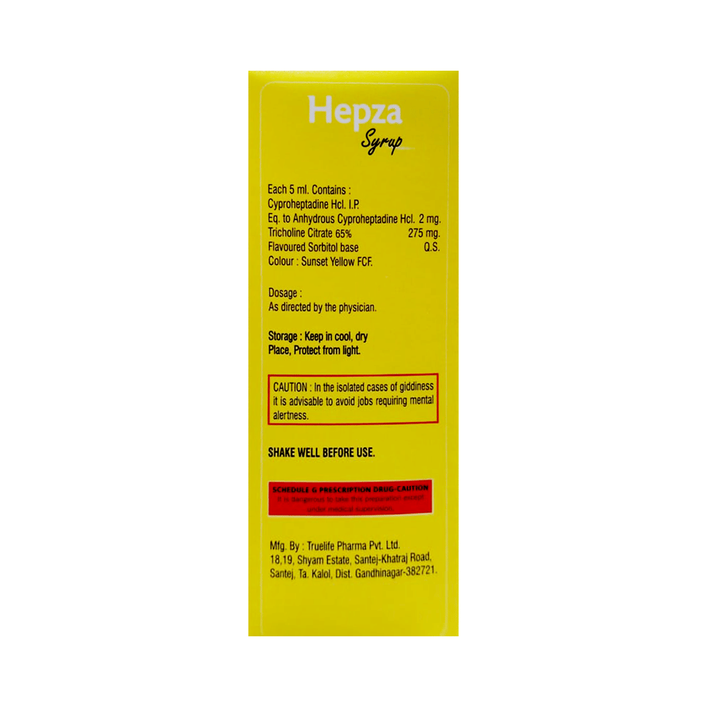 Hepza Syrup is a combination medicine used to treat loss of appetite. It is an effective appetite stimulant. It works by reducing the effect of a chemical messenger which regulates appetite. Hepza Syrup is taken with or without food in a dose and duration as advised by the doctor. The dose you are given will depend on your condition and how you respond to the medicine. You should keep taking this medicine for as long as your doctor recommends. Let your healthcare team know about all other medications you are taking as some may affect, or be affected by this medicine.The most common side effects are constipation, dryness in mouth, and blurred vision. Most of these are temporary and usually resolve with time. Contact your doctor straight away if you are at all concerned about any of these side effects. It can cause dizziness, so do not drive or do anything that requires mental focus until you know how this medicine affects you. Avoid drinking alcohol while taking this medicine as it can worsen your sleepiness.Never support self-medication or recommend your medicine to another person. Before taking it, you should tell your doctor if you have any kidney or liver diseases so that your doctor can prescribe a suitable dose for you. Pregnant or breastfeeding women should also consult their doctor.