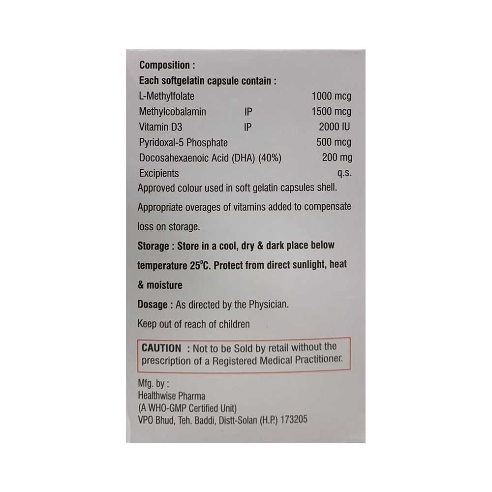 Salt Composition: L-Methyl Folate (1000mcg) + Methylcobalamin (1500mcg) + Pyridoxal-5-phosphate (500mcg) + Vitamin D3 (2000IU) + Docosahexanoic acid(DHA) (200mg)