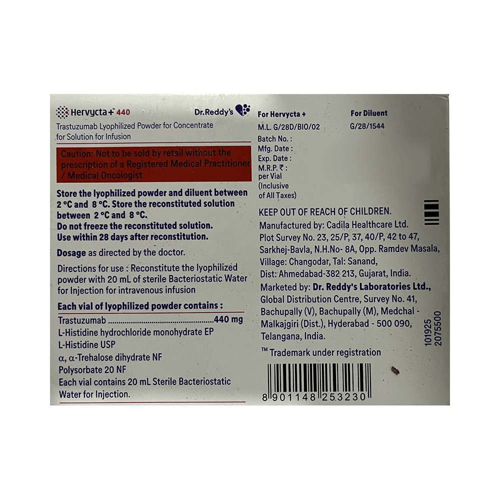 Hervycta 440 + Injection is used in the treatment of breast and stomach cancer. It works by killing the cancer cells by inhibiting HER2 (human epidermal growth factor receptor protein). Hervycta 440 + Injection is given as an injection by a qualified medical professional. Your doctor will decide what dose is necessary and how often you need to take it. This will depend on what you are being treated for and may change from time to time. You should take it exactly as your doctor has advised. Taking it in the wrong way or taking too much can cause very serious side effects. It may take several weeks or months for you to see or feel the benefits but do not stop taking it unless your doctor tells you to.The most common side effects of this medicine include nausea, headache, rash, insomnia, and infection. This medicine may reduce the number of blood cells (decrease red blood and white blood cells) in your blood, thereby, increasing the susceptibility to infections. Regular blood tests are required to check your blood cells along with heart, liver, and blood uric acid levels. You must have to inform your doctor if you experience breathlessness, cough, shivering, swelling of legs and arm.Many other medicines can affect, or be affected by, this medicine so let your healthcare team know all medications you are using. This medicine is not recommended during pregnancy or while breastfeeding. The use of effective contraception by both males and females during treatment is important to avoid pregnancy.