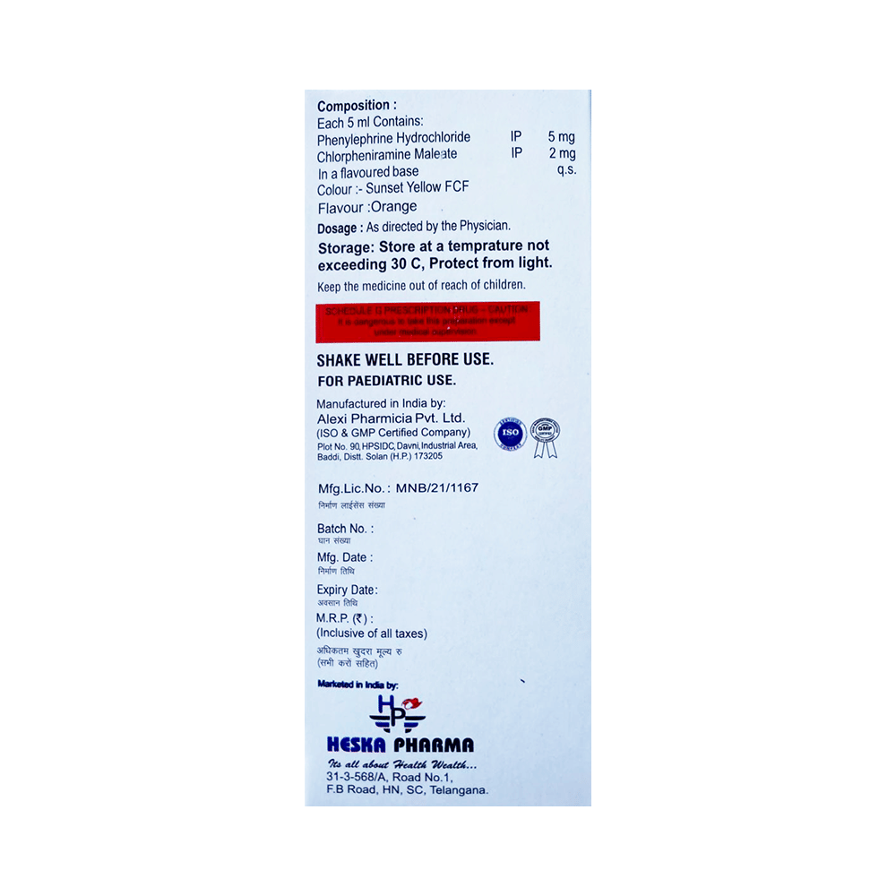 Salt Composition: Chlorpheniramine Maleate (2mg/5ml) + Phenylephrine (5mg/5ml)