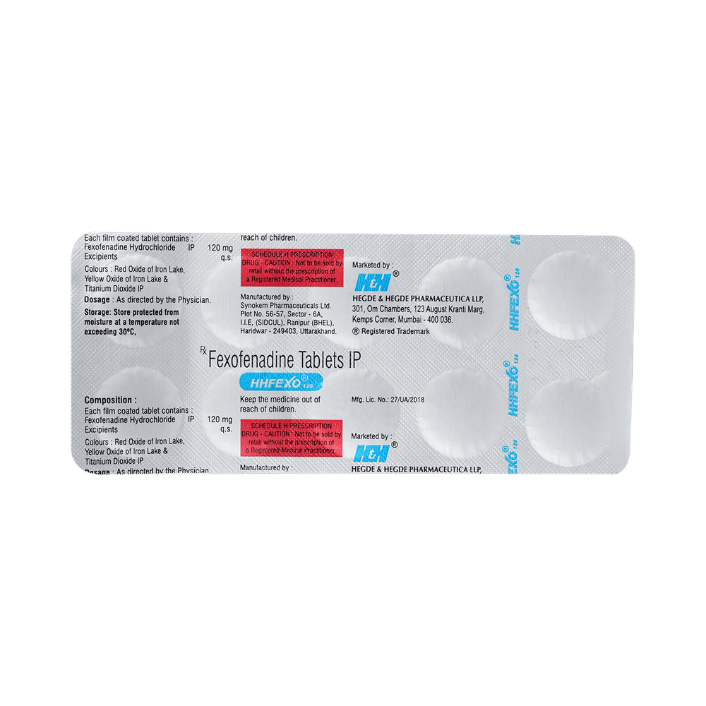 Hhfexo 120mg Tablet is an anti-allergy medicine used in the treatment of allergic symptoms such as runny nose, congestion or stuffiness, sneezing, itching, swelling, and watery eyes. It also helps treat skin allergies with itching, redness, or swelling. Hhfexo 120mg Tablet may be taken with or without food, in the dose and duration as advised by the doctor. The dose you are given will depend on your condition and how you respond to the medicine. You should keep taking this medicine for as long as your doctor recommends. Do not stop taking it without consulting your doctor.The most common side effects are headache, drowsiness, dizziness, and nausea. Most of these are temporary and usually resolve with time. Please consult your doctor if any of these side effects do not resolve or persist for a longer duration.Do not self-medicate or recommend your medicine to another person even if you see the similarity in symptoms. Consult your doctor to get the most benefit. Inform your doctor if you are suffering from any problems related to the kidneys, liver, or heart. Pregnant and breastfeeding mothers should not take this medicine without consulting a doctor.