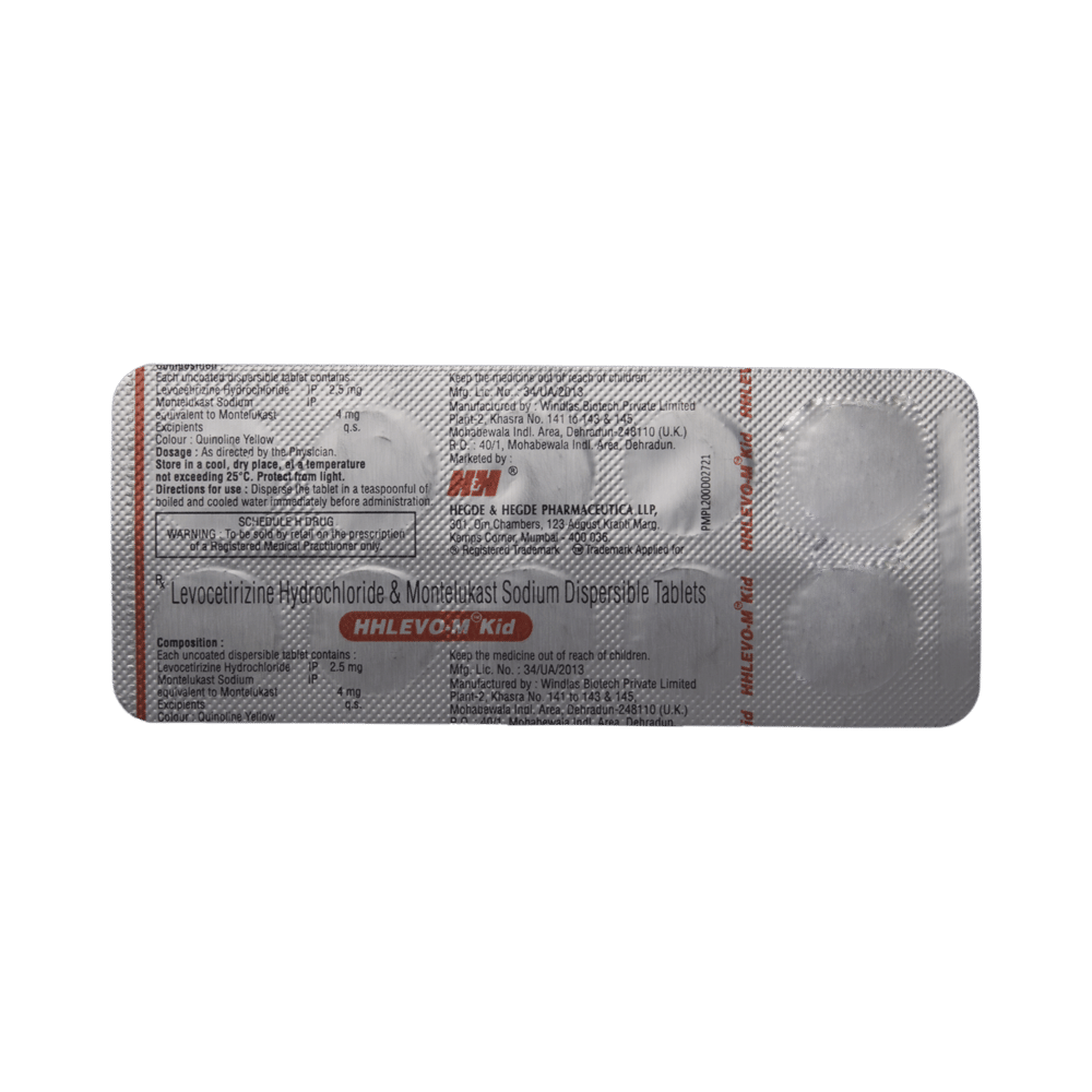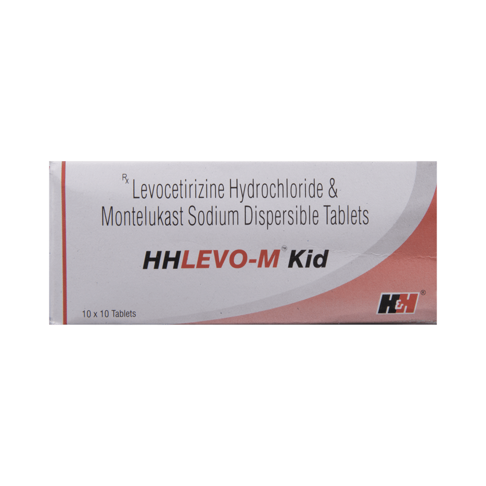HHlevo-M Kid Tablet DT is commonly prescribed in children to treat symptoms of allergy such as runny nose, sneezing, itching, swelling, congestion, and watery eyes. It may also help in the treatment of asthma and skin allergies. Give this medicine to your child at a fixed time before or after food in the prescribed dose, time, and way. For asthma, prefer giving HHlevo-M Kid Tablet DT in the evening or 2 hours before physical activity. For allergy, it is best to give it either in the morning or in the evening, depending upon the time of onset of symptoms. In case your child has both, prefer giving it in the evening. If your child vomits within 30 minutes of taking this medicine, give the same dose again, but skip it if it’s already time for the next dose.Your child may start to feel better after a few regular doses. However, you must still complete the prescribed dose to ensure maximum benefit. Moreover, stopping the medicine abruptly may worsen your child’s condition. This medicine may cause some minor and temporary side effects like vomiting, diarrhea, nausea, dizziness, dry mouth, rash, and headache. Usually, these episodes subside once your child’s body adapts to the medicine. However, in case these effects persist or start bothering your child, consult your child’s doctor without any delay.Let your child’s doctor know if your child is already taking any medicines. Also, narrate your child’s complete medical history, including any prior episodes of allergy, heart problem, blood disorder, vascular disorders, birth defects, airway obstruction, lung anomaly, skin disorder, liver impairment, and kidney malfunction. This information is critical for dose alterations and in planning your child’s overall treatment.