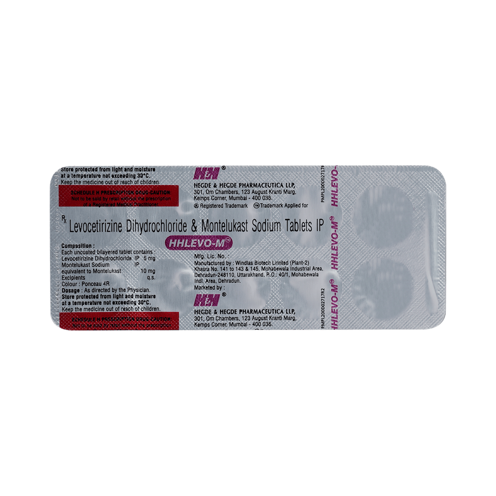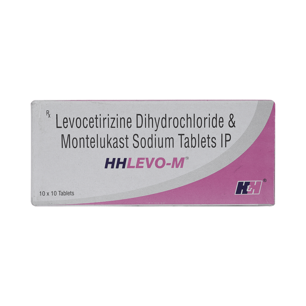 In Treatment of Allergic skin conditionsHHlevo-M Tablet is effective in treating allergic skin conditions with inflammation and itching. It reduces the actions of chemicals in the body that cause inflammation of the skin. When used correctly it is a safe and effective treatment. It reduces the redness, rash, pain or itchiness caused by your skin’s reaction to an irritant. It thus improves your self-esteem and confidence as your appearance changes. Keep taking it for as long as it is prescribed to get the full benefits.In Treatment of Sneezing and runny nose due to allergiesHHlevo-M Tablet is a combination medicine that provides relief from symptoms such as blocked or runny nose, sneezing and itchy or watery eyes. This will make it easier for you to go about your daily activities. It rarely has any serious side effects and you may only need to take it on days you have symptoms. If you are taking it to prevent getting symptoms you should use it regularly to get the most benefit.In Treatment of Hay feverHay fever, also called allergic rhinitis, causes cold-like signs and symptoms, such as a runny nose, itchy eyes, congestion, sneezing and sinus pressure. The only difference is that in hay fever, these symptoms are not produced due to a virus but are simply allergic responses of our body to allergens (allergy causing agents such as pollen). HHlevo-M Tablet is used to provide relief from these symptoms of hay fever. It works by blocking the release of the chemical substance responsible for producing such allergy symptoms. HHlevo-M Tablet is a safe medicine which helps treat hay fever and makes us feel at ease.show moreshow less