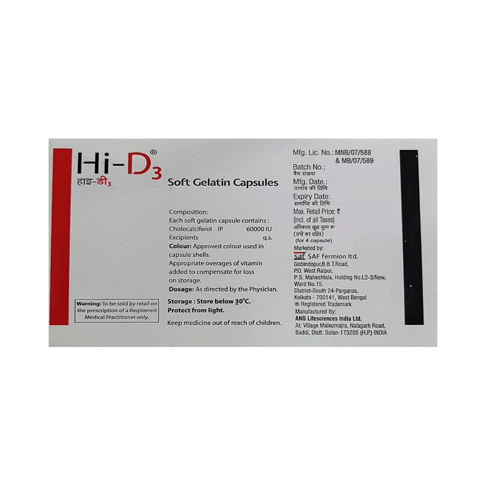 Hi-D3 60K Capsule is a form of vitamin D. It raises vitamin D levels in your blood. This, in turn, increases calcium levels in your blood by helping you absorb more calcium from food.