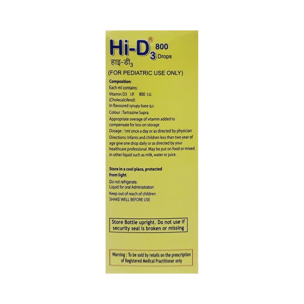 Take this medicine in the dose and duration as advised by your doctor. Check the label for directions before use. Measure it with a marked dropper and take it as directed. Hi-D3 800 Drops may be taken with or without food, but it is better to take it at a fixed time.
