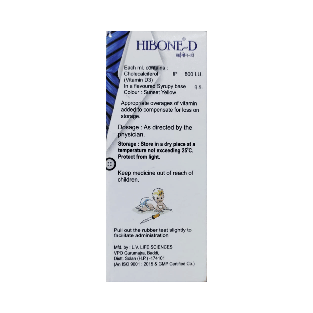Hibone-D Oral Drops 800IU/ml Mango Flavoured is used in the treatment of vitamin D deficiency and osteoporosis. It helps the body to absorb calcium. Calcium is essential for maintaining strong and healthy bones. It is used when your diet does not provide enough calcium. Hibone-D Oral Drops 800IU/ml Mango Flavoured should be taken as directed by your doctor. It is best taken with or after food, as this helps your body absorb it, and you should take it regularly to get the most benefits. If you are using it to treat osteoporosis, you will also be prescribed other medicines. This medicine may be only part of a complete treatment program that includes making changes to your diet and taking calcium and vitamin supplements. Learn about the foods you should eat to ensure you get enough calcium and vitamin D.Hibone-D Oral Drops 800IU/ml Mango Flavoured has few side effects, and none are common. If you take too much, you may feel weakness, muscle pain, or a metallic taste in your mouth. If you experience any such side effects, speak with your doctor. They may be able to help you reduce or treat the symptoms.Before taking this medicine, tell your doctor if you have high calcium levels in your blood or if you have any heart, kidney, or liver disease. Some other medicines can decrease the absorption of vitamin D3, so let your doctor know about all the other medicines you are taking to make sure you are safe. This medicine may help during pregnancy when your body needs more vitamin D, but too much could harm your baby. Discuss it with your doctor.