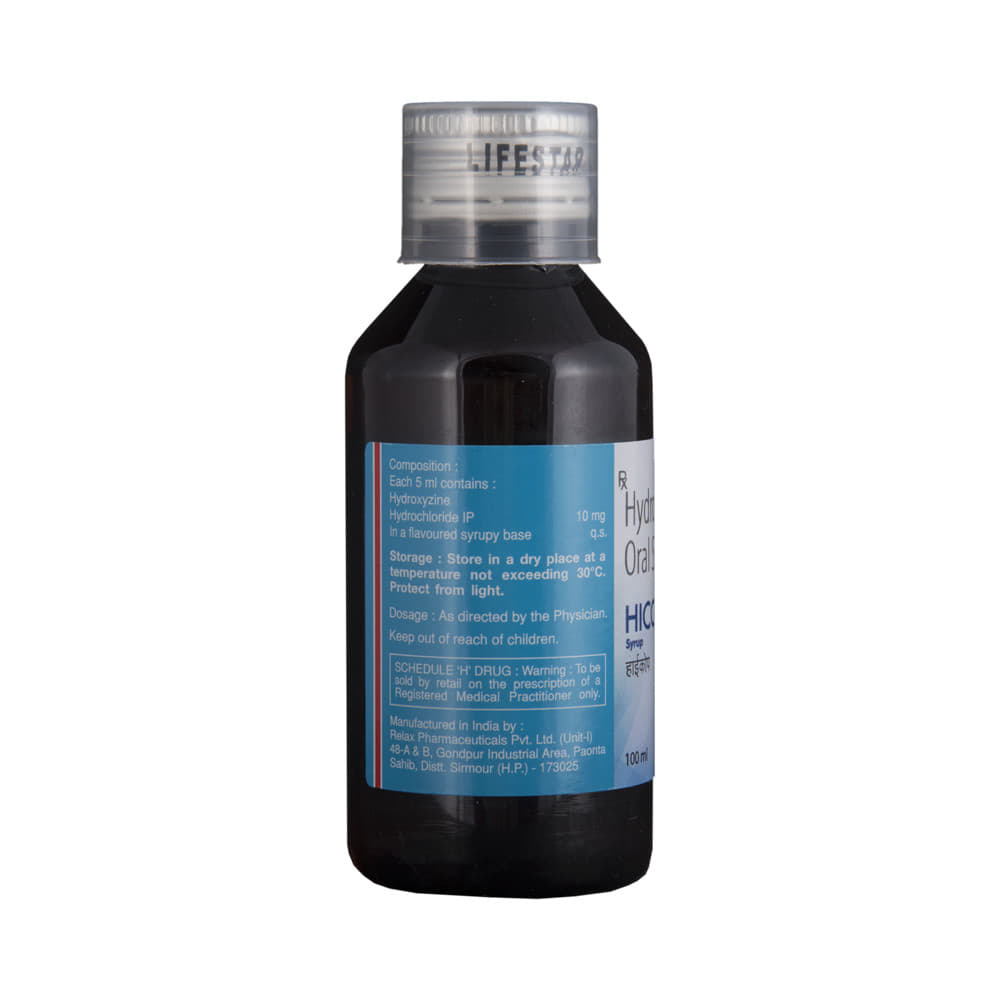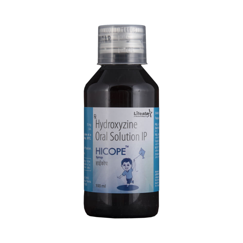HIcope Syrup is used to treat symptoms of skin allergy like itching, swelling, and rashes in conditions such as eczema, dermatitis, and psoriasis. It is also used to treat anxiety and helps to relax before or after surgery. HIcope Syrup should be taken with or without food. Take it exactly as your doctor has prescribed. The dose and how often you take it depend on what you are taking it for. Your doctor will decide how much you need to improve your symptoms. Take it for as long as it is prescribed for you. In case you have missed any doses, take the next dose as soon as you remember it. However, you should never take a double dose.The most common side effects of this medicine include drowsiness, dizziness, blurred vision, constipation, and dry mouth. If these bother you or appear serious, let your doctor know. There may be ways of reducing or preventing them.Before taking this medicine, let your doctor know if you have heart problems, high blood pressure, or liver or kidney problems. Inform your doctor if you are pregnant or breastfeeding. Your doctor should also know about all other medicines you are taking, as many of these may make this medicine less effective or change the way it works. Generally, it is advised to avoid alcohol while on treatment.
