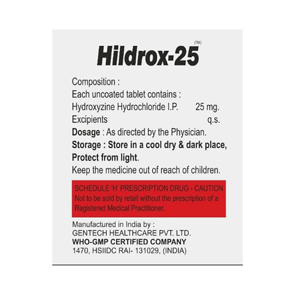 Hildrox 25 Tablet is an antihistaminic medication. In allergy, it works by blocking the action of a chemical messenger (histamine). This relieves allergy symptoms such as itching, swelling, and rashes. In short-term anxiety, it works by decreasing the activity in the brain, thereby helping you feel relaxed/sleepy.