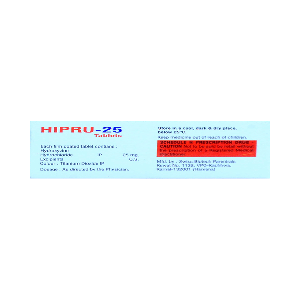 Hipru 25 Tablet is used to treat symptoms of skin allergy like itching, swelling, and rashes in conditions such as eczema, dermatitis, and psoriasis. It is also used to treat anxiety and helps to relax before or after surgery. Hipru 25 Tablet should be taken with or without food. Take it exactly as your doctor has prescribed. The dose and how often you take it depend on what you are taking it for. Your doctor will decide how much you need to improve your symptoms. Take it for as long as it is prescribed for you. In case you have missed any doses, take the next dose as soon as you remember it. However, you should never take a double dose.The most common side effects of this medicine include drowsiness, dizziness, blurred vision, constipation, and dry mouth. If these bother you or appear serious, let your doctor know. There may be ways of reducing or preventing them.Before taking this medicine, let your doctor know if you have heart problems, high blood pressure, or liver or kidney problems. Inform your doctor if you are pregnant or breastfeeding. Your doctor should also know about all other medicines you are taking, as many of these may make this medicine less effective or change the way it works. Generally, it is advised to avoid alcohol while on treatment.