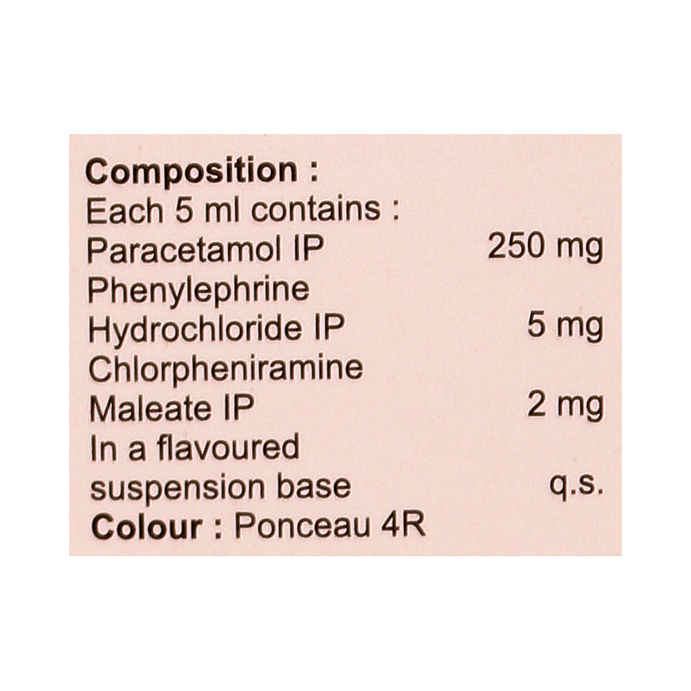 Salt Composition: Chlorpheniramine Maleate (2mg/5ml) + Paracetamol (250mg/5ml) + Phenylephrine (5mg/5ml)