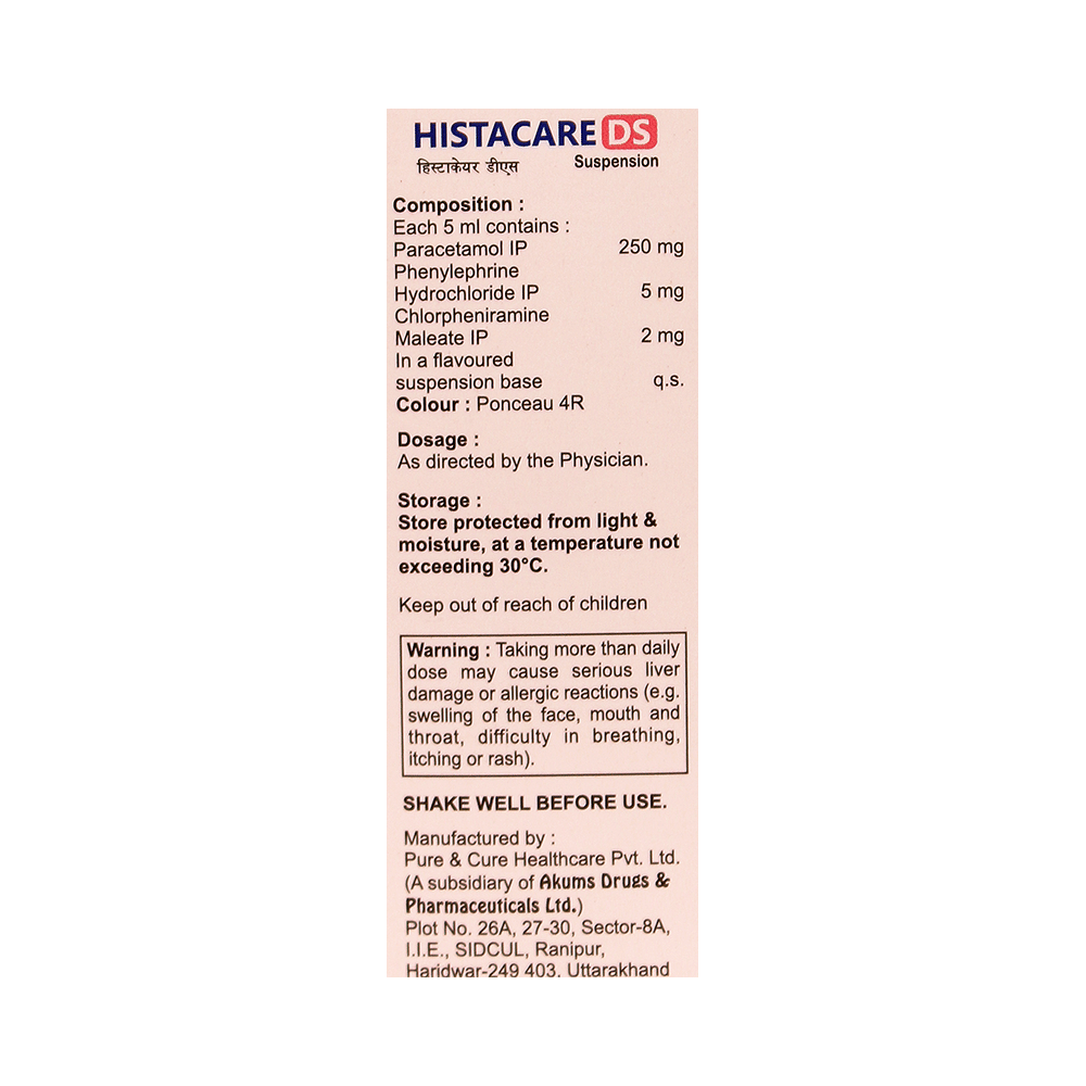 Histacare DS Oral Suspension is a medicine used in the treatment of common cold symptoms. It provides relief from symptoms such as headache, sore throat, runny nose, muscular pain, and fever. Histacare DS Oral Suspension can be taken with or without food. The dose and duration will depend on the severity of your condition. You should keep taking the medicine even if you feel better until the doctor says it is alright to stop using it.Using this medicine may cause a few common side effects such as nausea, vomiting, sleepiness, dizziness, and headache. If any of these side effects do not resolve with time or get worse, you should let your doctor know. Your doctor may be able to suggest ways of preventing or reducing the side effects. In general, you should try to use the smallest amount necessary to control your symptoms.Before using the medicine, you should tell your doctor if you have any other medical conditions or disorders. To make sure it is safe, you should let your doctor know all the other medicines you are taking. Also, tell your doctor if you have any problems with the liver or kidneys. Avoid consumption of alcohol while on treatment with this medicine as it may increase the chance of some side effects. Pregnant and breastfeeding women should consult their doctors first before using the medicine.