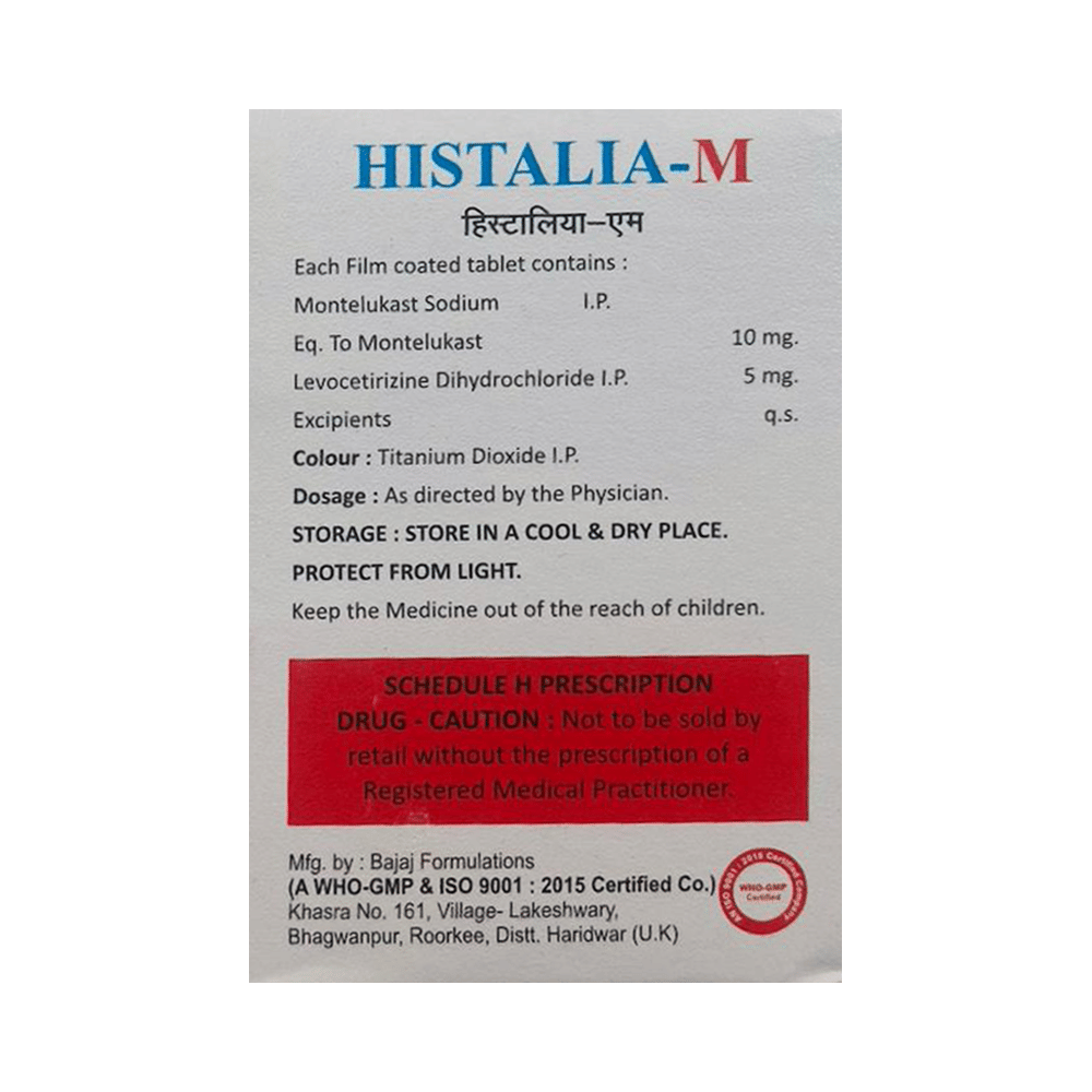 Histalia-M Tablet is a combination medicine used in the treatment of allergic symptoms such as runny nose, stuffy nose, sneezing, itching, swelling, watery eyes and congestion or stuffiness. It also reduces inflammation in the airways and make breathing easier. Histalia-M Tablet is taken with or without food in a dose and duration as advised by the doctor. The dose you are given will depend on your condition and how you respond to the medicine. You should keep taking this medicine for as long as your doctor recommends. If you stop treatment too early your symptoms may come back and your condition may worsen. Let your healthcare team know about all other medications you are taking as some may affect, or be affected by this medicine.The most common side effects are nausea, diarrhea, vomiting, dryness in the mouth, headache, skin rash, flu-like symptoms, and fatigue. Most of these are temporary and usually resolve with time. Contact your doctor straight away if you are at all concerned about any of these side effects. This medicine may cause dizziness and sleepiness, so do not drive or do anything that requires mental focus until you know how this medicine affects you. Avoid drinking alcohol while taking this medicine as it can worsen your sleepiness.Never support self-medication or recommend your medicine to another person. It is beneficial to have plenty of fluids while taking this medication. Before you start taking this medicine it is important to inform your doctor if you are suffering from kidney disease.