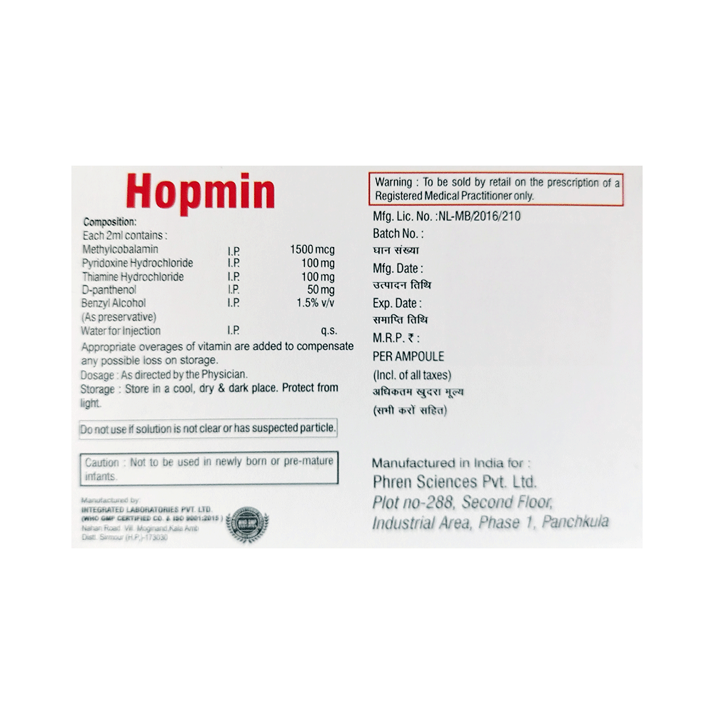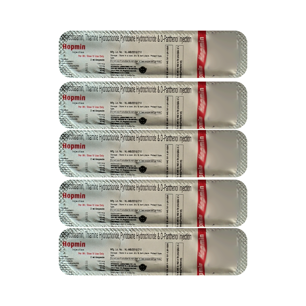 Hopmin Injection is a combination of four group B vitamins. Methylcobalamin corrects vitamin B12 deficiency thereby helping in treating certain anemias and nerve problems. Pyridoxine (vitamin B6) treats or prevents deficiency of vitamin B6 and improves functioning of nervous and immune systems. Thiamine (vitamin B1) is required by the body to properly use carbohydrates. It also helps maintain proper nerve function. D-Panthenol promotes the utilization of fats and carbohydrates to release energy. It also acts like a skin moisturizer and improves hydration, reduces water loss, and maintains the softness and elasticity of the skin. It also accelerates the wound-healing process.