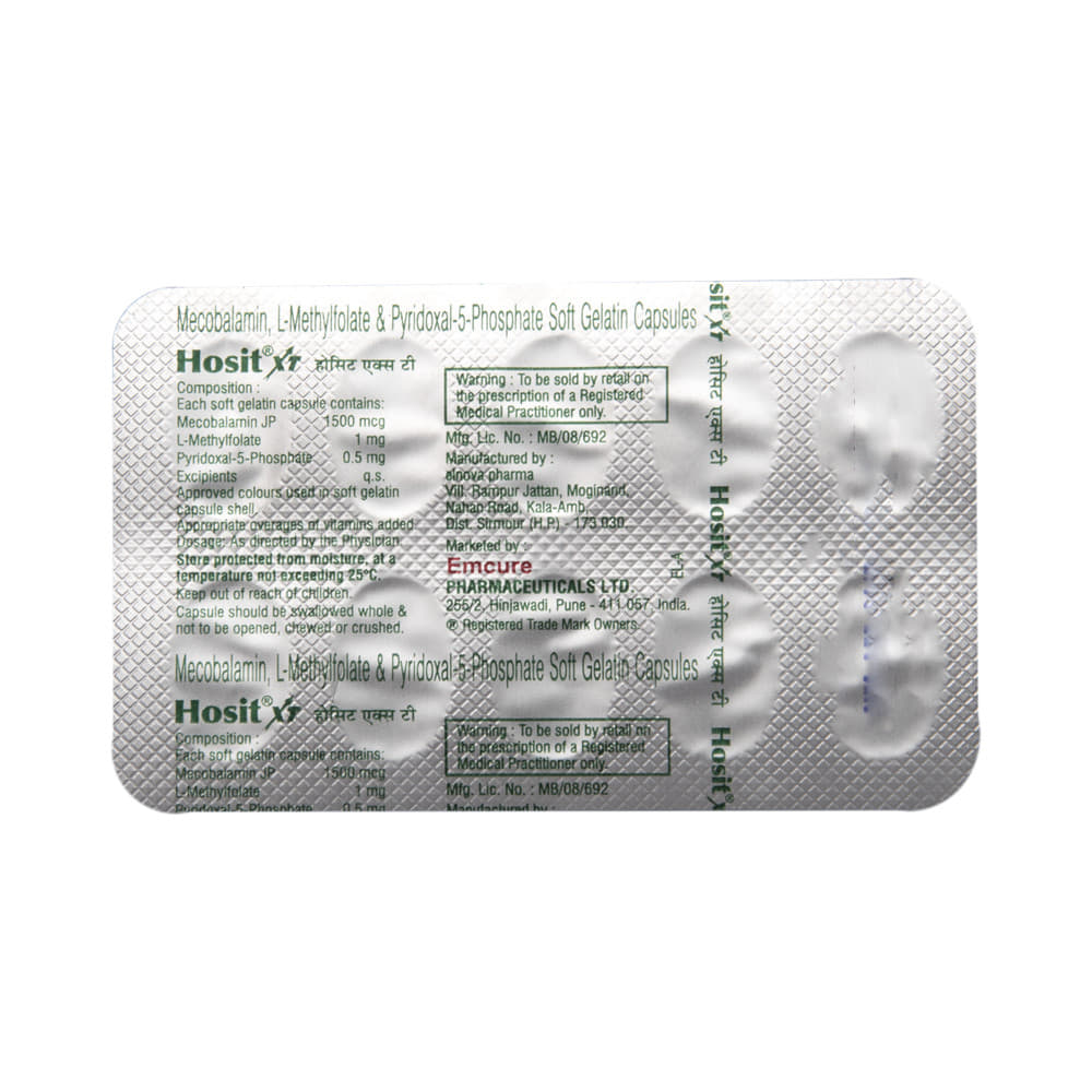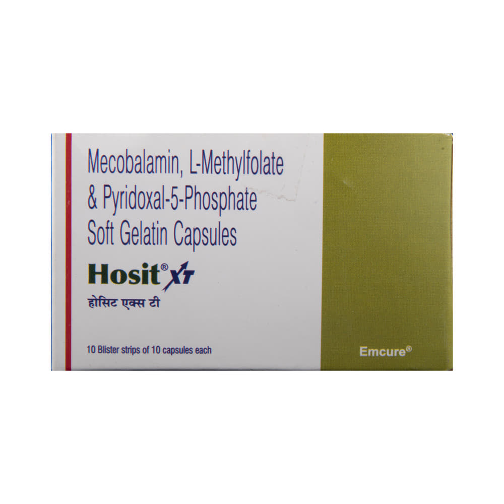 Hosit XT Capsule is a combination of three nutritional supplements. L-Methyl Folate is a form of folate that replenishes the folic acid deficiency, this in turn helps in the formation of new red blood cells to treat or prevent anemia. Methylcobalamin and Pyridoxal-5-phosphate are vitamins. They restore any vitamin deficiencies in the body. This helps in maintaining proper hormonal balance in the body to ensure appropriate growth and functioning of the organs.