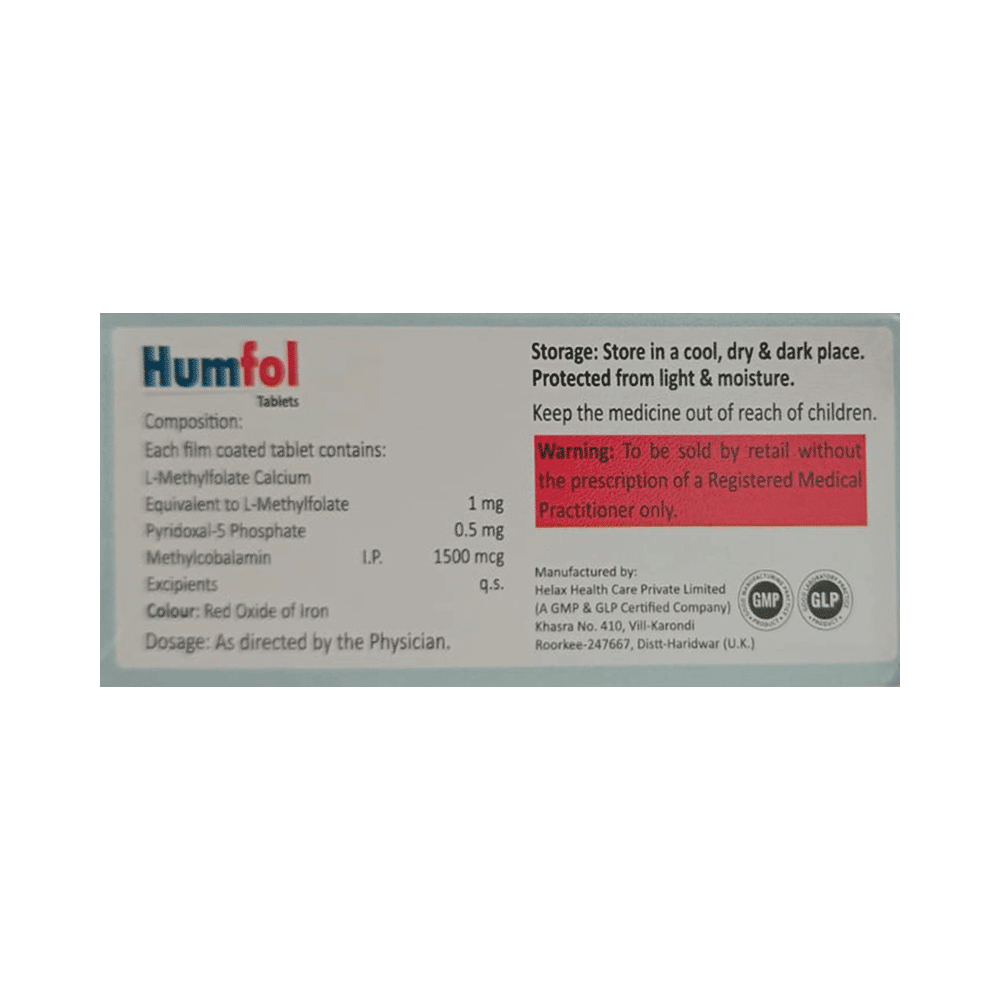 Humfol Tablet is a combination of three nutritional supplements. L-Methyl Folate is a form of folate that replenishes the folic acid deficiency, this in turn helps in the formation of new red blood cells to treat or prevent anemia. Methylcobalamin and Pyridoxal-5-phosphate are vitamins. They restore any vitamin deficiencies in the body. This helps in maintaining proper hormonal balance in the body to ensure appropriate growth and functioning of the organs.