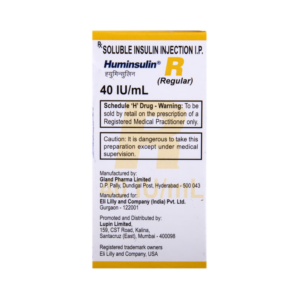 Huminsulin R 40IU/ml Solution for Injection is a short-acting insulin, which starts working within 30 minutes after injection. It works similar to the insulin produced by the body. Insulin facilitates reuptake of sugar in muscle and fat cells and also suppresses the production of sugar in the liver.