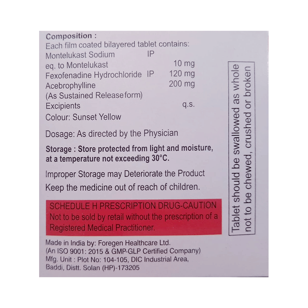 Salt Composition: Montelukast (10mg) + Fexofenadine (120mg) + Acebrophylline (200mg)