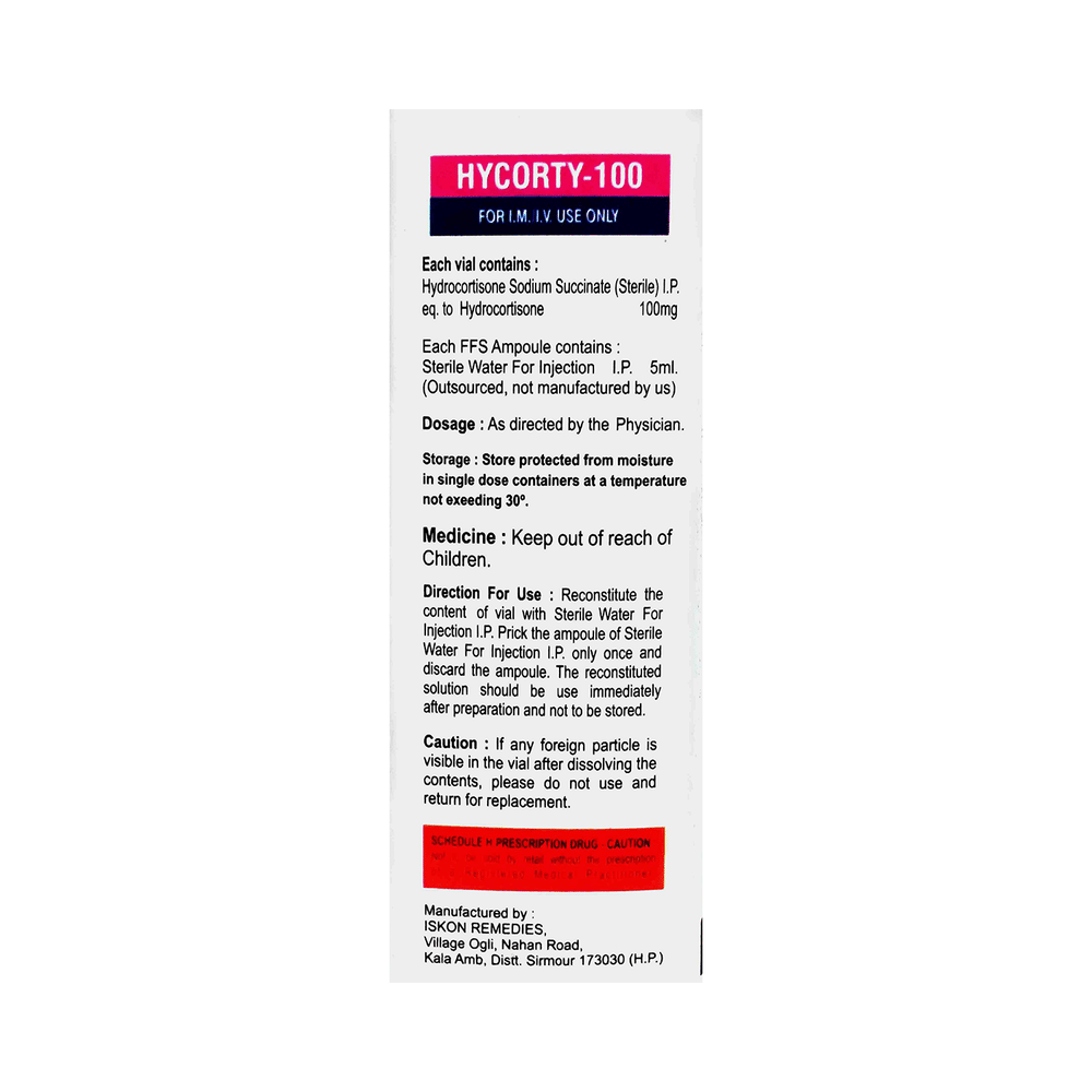 In Treatment of Allergic conditionsHycorty 100 Injection prevents the release of substances in the body that cause inflammation. It can be used to treat a great many different inflammatory and allergic conditions including arthritis, lupus, psoriasis, ulcerative colitis which affect the skin, blood, eyes, lungs, stomach, and nervous system. It works by lowering your immune system’s response to these conditions thereby reducing symptoms such as swelling, pain, itching and other allergic-type reactions.You should always take it as it has been prescribed for you. Do not stop taking it without your doctor’s advice. This can cause unpleasant withdrawal symptoms. Because this medicine weakens your immune system, you should avoid being near people who are ill or have infections.In Severe allergic reactionsHycorty 100 Injection is a corticosteroid. In addition to the many other benefits, it can be used in the treatment of severe allergic reactions. This medicine works by reducing the inflammation associated with allergies. It is a highly effective medicine. Take it in the exact dose and duration as prescribed by your doctor to get most benefit from it.In Treatment of CancerHycorty 100 Injection helps in the treatment for a variety of cancers, such as leukemia, lymphoma and multiple myeloma. It works by suppressing the immune system thereby reducing inflammation around the site of the cancer. It is used specifically to decrease swelling (edema), associated with tumors of the spine and brain. Moreover, it helps to treat or prevent allergic reactions in cancer patients. This medicine also treats nausea and vomiting associated with some chemotherapy medicines. Besides, it is also used to stimulate appetite in cancer patients with severe appetite problems, thus aiding in cancer treatment.In Treatment of Skin disordersHycorty 100 Injection prevents the release of substances in the body that cause inflammation. It can be used to treat a great many different inflammatory and allergic conditions of the skin such as eczema, atopic dermatitis and psoriasis. It works by lowering your immune system’s response to these conditions thereby reducing symptoms such as swelling, pain, itching and other allergic-type reactions.In Treatment of Eye disordersHycorty 100 Injection helps relieve symptoms of eye infections such as redness, swelling, itching and watering of eyes. This medicine works by decreasing the production of certain chemicals that cause inflammation of the eyes. This will make it easier for you to go about your daily activities. Use it as prescribed to get the most benefit. If you see no improvement even after a week, talk to your doctor.show moreshow less