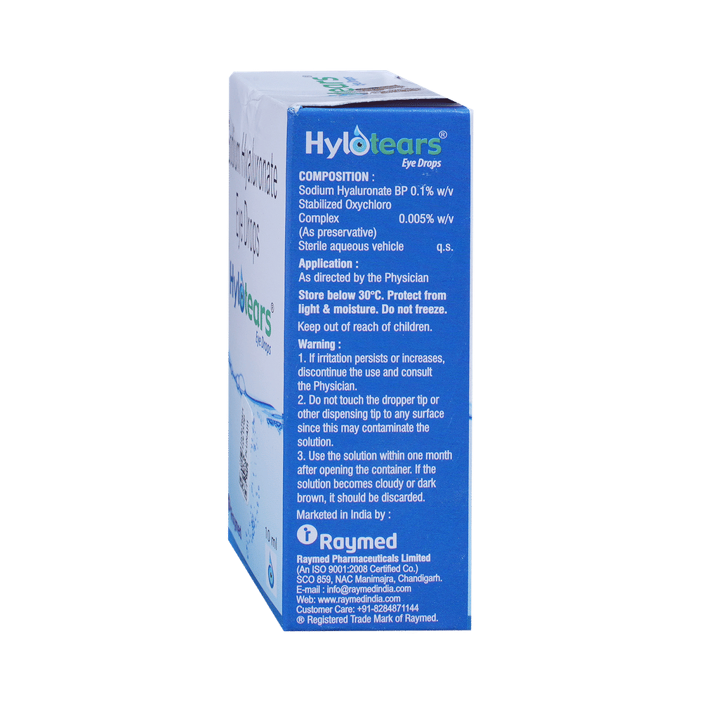 HYLOtears Eye Drop is a lubricant. It is used in the treatment of dry eyes. It moistens the eyes and provides relief from discomfort and temporary burning. It also helps in treating corneal burns by forming a soothing layer that reduces irritation and protects the damaged cornea. HYLOtears Eye Drop is usually instilled whenever needed. Take the dosage as advised by your doctor. Wait for at least 5-10 minutes before delivering any other medication in the same eye to avoid dilution. Do not use a bottle if the seal is broken before you open it, or if the solution changes color, or becomes cloudy.Common side effects of HYLOtears Eye Drop include blurred vision, redness, irritation in the eye, sensitivity to light, and watery eyes. Do not avoid notifying your doctor if any of these side effects persist or worsen.Always wash your hands and do not touch the end of the dropper, as this could infect your eye. It is generally safe to use HYLOtears Eye Drop with no common side effects. Let your doctor know if you experience any mild burning or irritation of your eyes.Do not drive, use machinery, or do any activity that requires clear vision until you are sure you can do it safely. Consult your doctor if your condition does not improve or if the side effects bother you. People with narrow-angle glaucoma should not use this medicine.