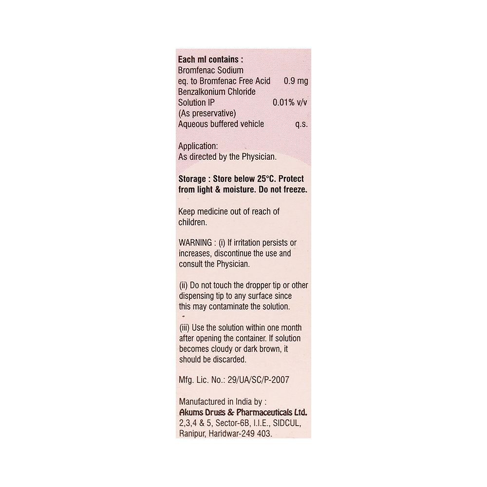 I-Brom Eye Drop is a pain-relieving medicine. It is used to treat postoperative eye pain and inflammation in patients who have undergone cataract surgery. Always wash your hands before using I-Brom Eye Drop. Use only the number of drops that your doctor has prescribed and wait for about five minutes between each drop. If you wear contact lenses, remove them before using the drops and wait for at least 15 minutes before putting them back in. You should not touch the tip of the dropper or bottle. This may lead to infection.Use of the medicine may cause blurred vision, increased sensitivity to light, change in color vision, decreased vision, eye pain, sore eyes, teary eye, and headache. These are usually temporary and resolve with time. However, if they persist or get worse, you should let your doctor know. Your doctor may be able to suggest ways of preventing or reducing the symptoms.Before using this medicine, you should tell your doctor about all the other medicines you are taking. You should also tell your doctor if you have any other medical conditions or disorders. Pregnant and breastfeeding women should consult with their doctors before using the medicine.