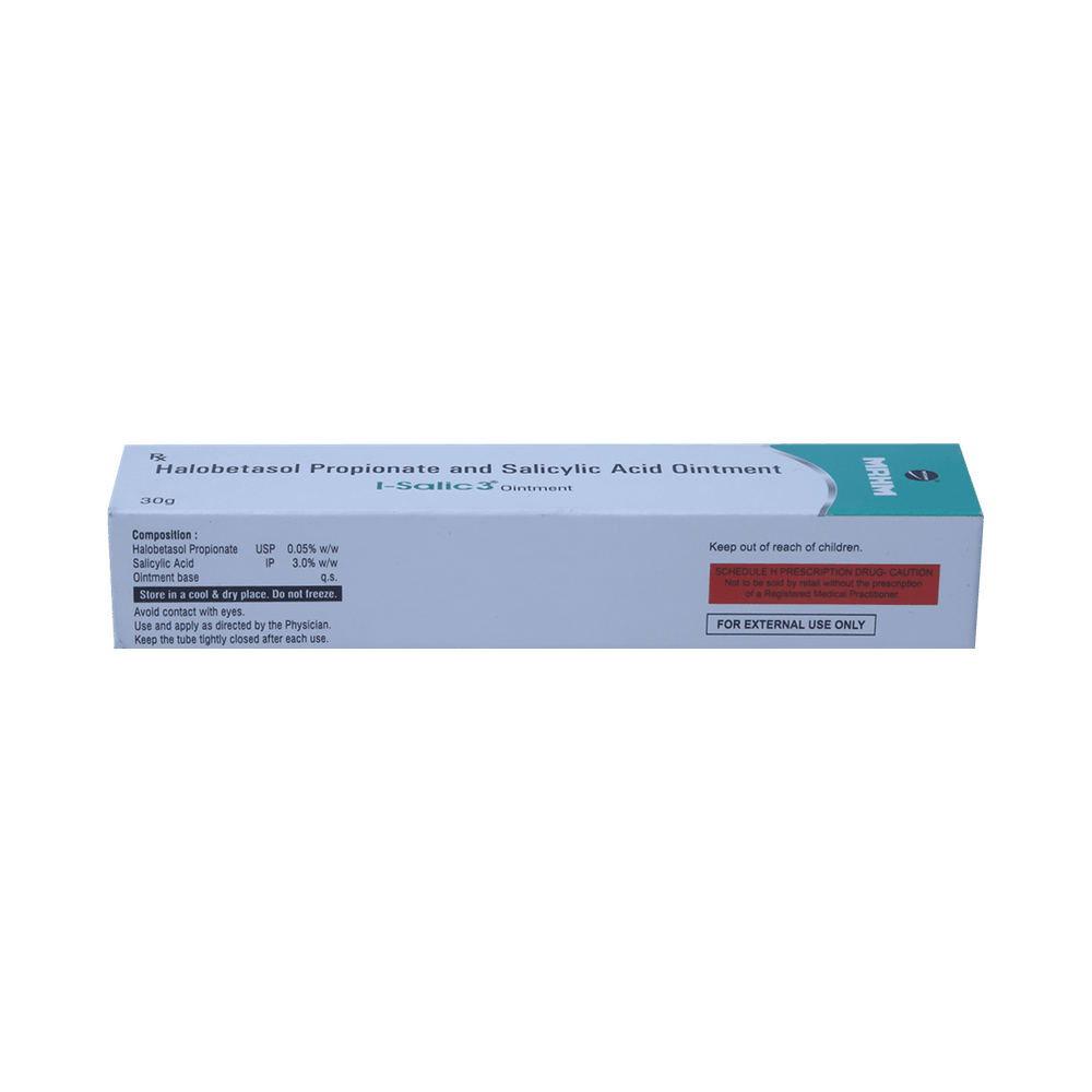 I Salic 3 Ointment is a combination of two medicines: Halobetasol and Salicylic Acid which treat eczema and psoriasis. Halobetasol is a steroid medicine. It blocks the production of certain chemical messengers (prostaglandins) that make the skin red, swollen and itchy. Salicylic Acid is a keratolytic medicine which breaks down keratin clumps, removes dead skin cells and softens the skin. It also enhances the absorption of Halobetasol into the skin.