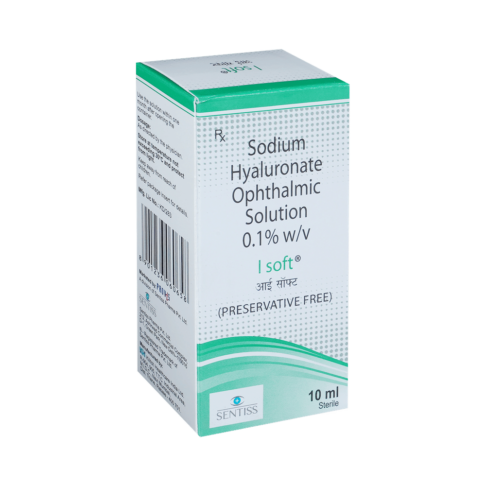 I Soft Ophthalmic Solution is a lubricant. It is used in the treatment of dry eyes. It moistens the eyes and provides relief from discomfort and temporary burning. It also helps in treating corneal burns by forming a soothing layer that reduces irritation and protects the damaged cornea. I Soft Ophthalmic Solution is usually instilled whenever needed. Take the dosage as advised by your doctor. Wait for at least 5-10 minutes before delivering any other medication in the same eye to avoid dilution. Do not use a bottle if the seal is broken before you open it, or if the solution changes color, or becomes cloudy.Common side effects of I Soft Ophthalmic Solution include blurred vision, redness, irritation in the eye, sensitivity to light, and watery eyes. Do not avoid notifying your doctor if any of these side effects persist or worsen.Always wash your hands and do not touch the end of the dropper, as this could infect your eye. It is generally safe to use I Soft Ophthalmic Solution with no common side effects. Let your doctor know if you experience any mild burning or irritation of your eyes.Do not drive, use machinery, or do any activity that requires clear vision until you are sure you can do it safely. Consult your doctor if your condition does not improve or if the side effects bother you. People with narrow-angle glaucoma should not use this medicine.