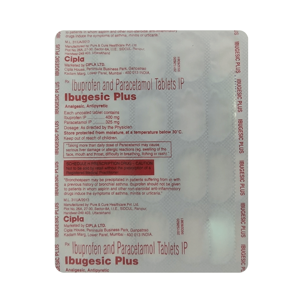 IBUgesic Plus Tablet is a combination of two medicines: Ibuprofen and Paracetamol. It works by blocking the release of certain chemical messengers that cause fever, pain and inflammation (redness and swelling).