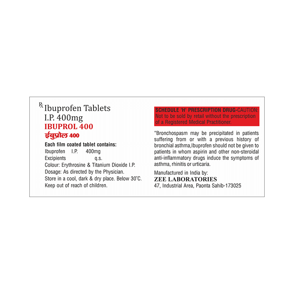 Ibuprol 400 Tablet is a pain-relieving medicine. It is used to treat many conditions such as headache, fever, period pain, toothache, colds, and mild arthritis. It is also a common ingredient in many cold and flu remedies. Ibuprol 400 Tablet should be taken with food to avoid stomach upset and reduce side effects. In general, you should try to use the smallest amount necessary to control your symptoms, for the shortest possible time. You should take this medicine regularly while you need it. Try not to miss doses as it will become less effective if you do.The medicine is well tolerated with little or no side effects. However, it may cause vomiting, stomach pain, nausea, and indigestion in some people. If any of these side effects do not resolve with time or get worse, you should let your doctor know. Your doctor may be able to suggest ways of preventing or reducing the symptoms.This medicine is widely prescribed and considered safe but is not suitable for everybody. Before you take it, you should tell your doctor if you have kidney problems, asthma, blood disorders, or drink a lot of alcohol. Also, tell your doctor what other medicines you are taking to make sure you are safe. It is best to avoid drinking alcohol while using this medicine.