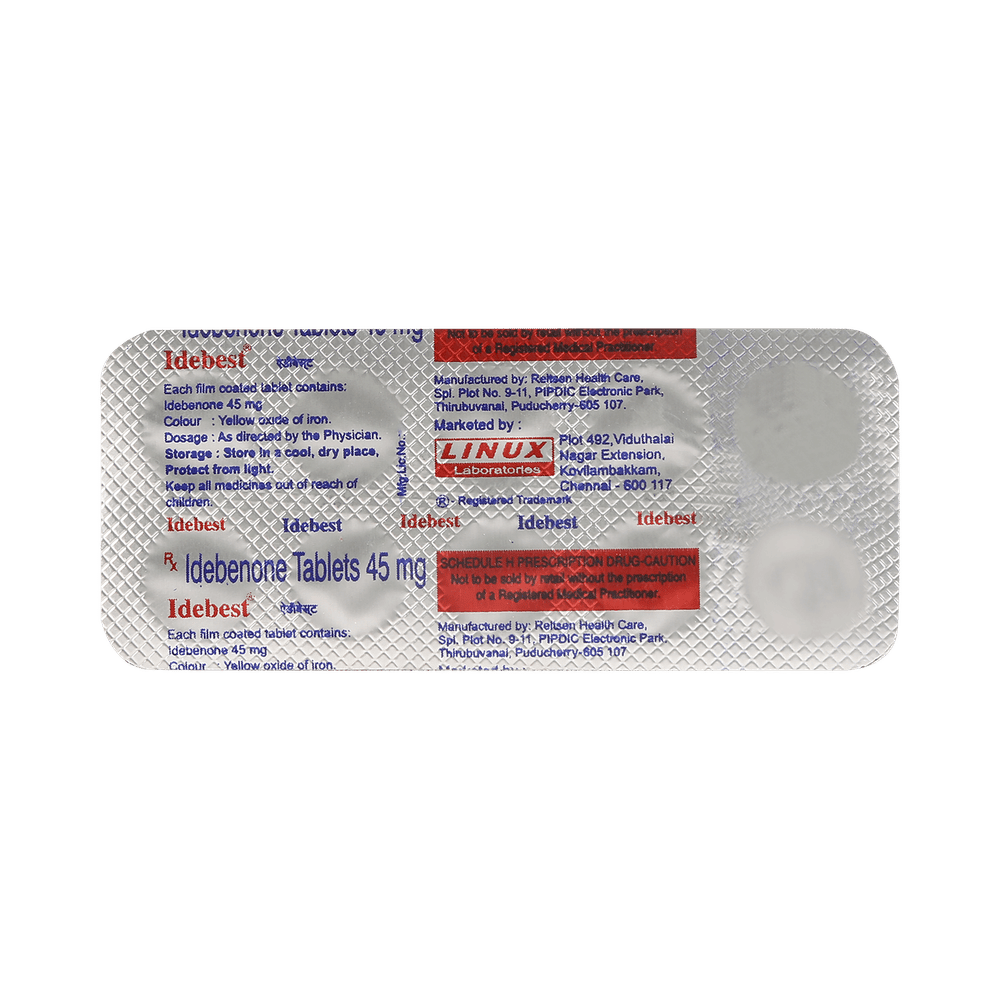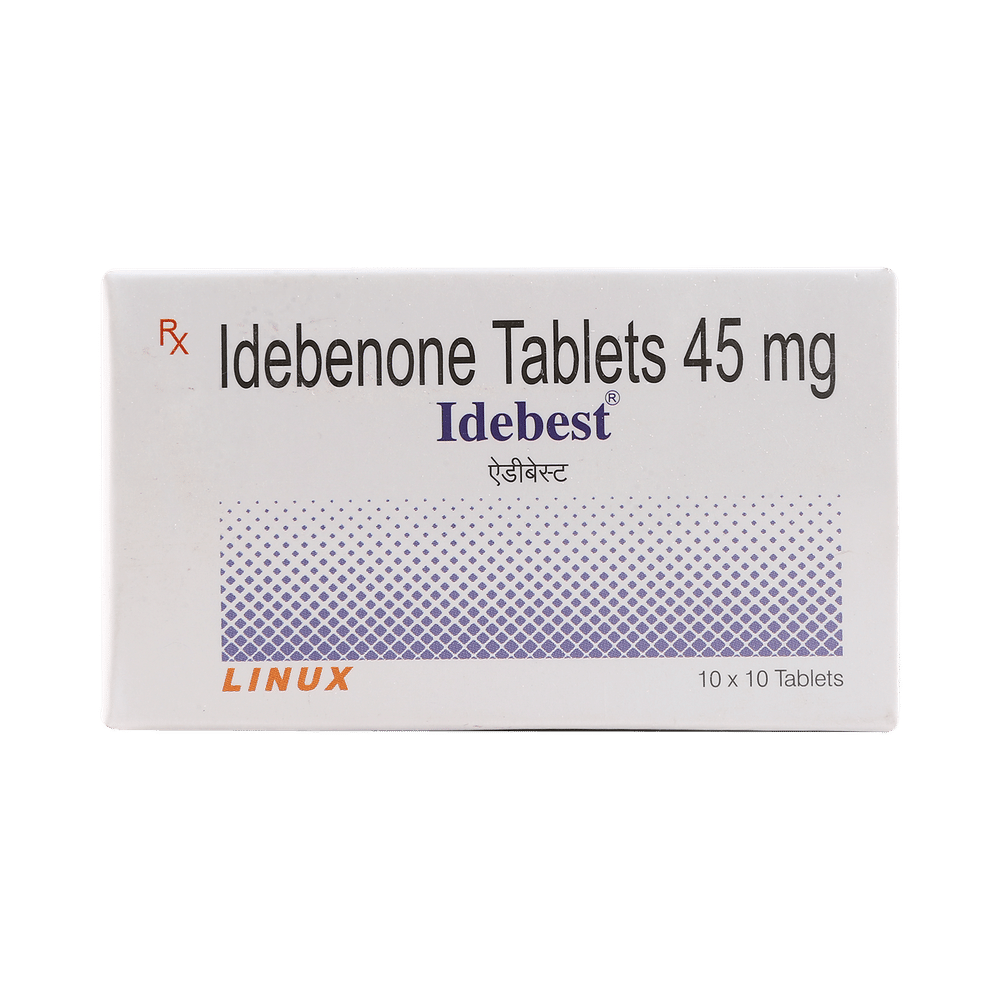Idebest 45mg Tablet is a prescription medicine used to treat Friedreich's ataxia and vision impairment in patients with Leber’s hereditary optic neuropathy, an eye disorder that can lead to loss of eyesight. This way it helps in improving the lost eyesight. Idebest 45mg Tablet is taken with food, preferably at the same time each day. Take this medicine as advised by your doctor and if you have missed a dose, take it as soon as you remember. Do not skip any doses and finish the full course of treatment. It is important that this medication is not stopped suddenly without talking to your doctor.Some common side effects of using this medication are inflammation of the throat and nasal passages, cough, and back pain. This medicine may cause diarrhea, so drink plenty of fluids to keep yourself hydrated while taking this medicine. It may make your urine reddish-brown in color but it is harmless.Before taking this medicine, please inform your doctor if you have a history of liver or kidney diseases. Moreover, your doctor may regularly monitor your eyesight, blood counts, and liver function while you are on treatment with this medicine.