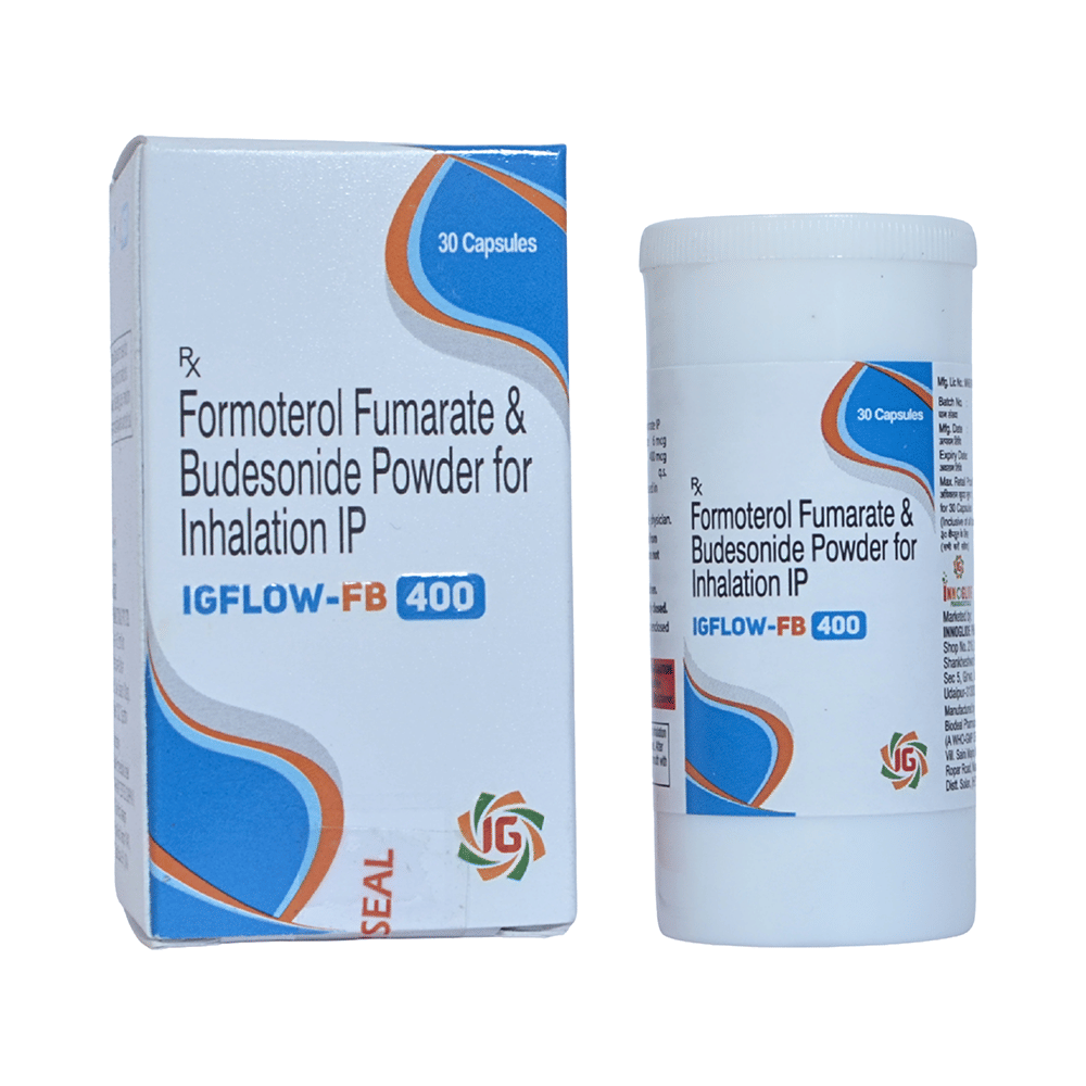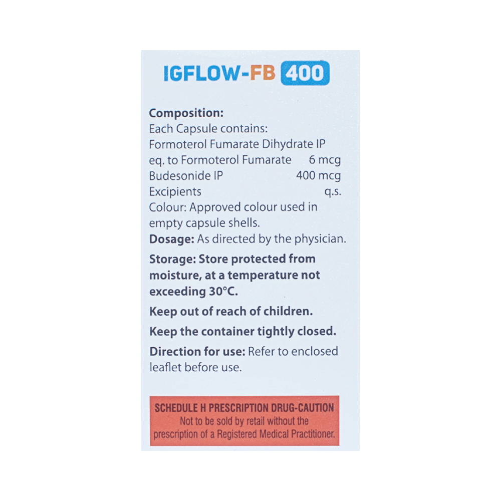 Igflow-FB 400 Capsule is a combination of two medicines in one inhaler. It relieves the long-term symptoms of asthma and COPD, making breathing easier. It works by inhibiting the release of certain chemical messengers that cause inflammation (swelling) and relaxes the muscles in the airways. Your doctor will tell you how often you need to use your inhaler. The effect of this medicine may be noticeable after a few days but will only reach its maximum after a few weeks. This medicine must be used regularly to be effective, so go on taking it even if you don't have any symptoms. That means it’s doing its job. If you stop taking it your symptoms may get worse. This medicine should not be used to relieve sudden shortness of breath. If sudden shortness of breath occurs, use your rescue inhaler. To get the benefit from this medicine you need to make sure you get your inhaler technique right, otherwise, it does not work as well.The most common side effects include headache, nausea, vomiting, stomach discomfort, and respiratory tract infection. If you get there, don’t stop taking it but do talk to your doctor. You can prevent some of these symptoms by rinsing your mouth and throat with water or brushing your teeth after using your inhaler. There are other, rarer side effects which can be serious. Talk to your doctor if you're worried about them.Before taking it, you should tell your doctor if you have any kidney or liver diseases so that your doctor can prescribe a suitable dose for you. You should also tell your doctor if you are pregnant, planning pregnancy or breastfeeding.