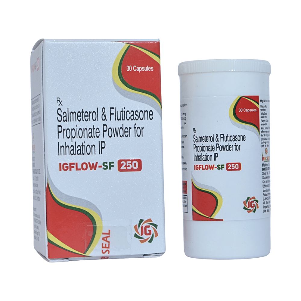 Igflow-SF 250 Capsule is a combination of two medicines that opens the airways and makes it easier to breathe. It is used in the treatment of asthma (wheezing and shortness of breath) and chronic obstructive pulmonary disorder (a lung disorder in which the flow of air to the lungs is blocked). Your doctor will tell you how often you need to use your inhaler. The effect of this medicine may be noticeable after a few days but will only reach its maximum after a few weeks. This medicine must be used regularly to be effective, so go on taking it even if you don't have any symptoms. That means it’s doing its job. If you stop taking it your asthma and chronic obstructive pulmonary disorder (COPD) may get worse. It should not be used to relieve sudden asthma attacks. If an asthma attack occurs, use your quick-relief inhaler (reliever). To get the benefit from this medicine you need to make sure you get your inhaler technique right, otherwise, it does not work as well.The most common side effects are nausea, vomiting, respiratory tract infection, fungal infections in the mouth, headache, hoarseness of voice, sore throat, cough, musculoskeletal (bone, muscle, or joint) pain, and increased heart rate. If you get there, do not stop taking it but do talk to your doctor. You can help prevent some of these symptoms by rinsing your mouth and throat with water or brushing your teeth after using your inhaler. There are other, rarer side effects that can be serious. Talk to your doctor if you're worried about them. In general, you should be trying to avoid situations that make your asthma worse (your triggers) and try not to smoke.Ask your doctor whether it’s safe to take this medicine if you're pregnant or breastfeeding. Before taking it, you should tell your doctor if you have any kidney or liver diseases so that your doctor can prescribe a suitable dose for you.
