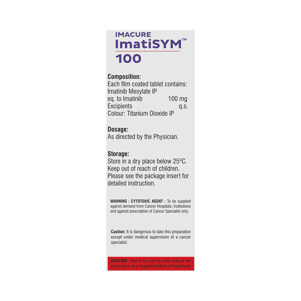 Imacure ImatiSYM 100 Tablet is used to treat several types of cancers. It is most commonly prescribed to treat blood cancers (chronic myeloid leukemia and acute lymphocytic leukemia) and gastrointestinal stromal tumors. It works by targeting specific proteins that contribute to the growth and spread of cancer cells. Imacure ImatiSYM 100 Tablet is also used for treatment of a skin tumor called dermatofibrosarcoma protuberans and a type of bone marrow condition called aggressive systemic mastocytosis. The medicine should be taken with food. Take it at the same time each day to get the most benefit. Continue taking it as long as your doctor advises for it. The duration of treatment varies according to your need and response to treatment. Taking it in the wrong way or taking too much can cause very serious side effects. It may take several weeks or months for you to see or feel the benefits but do not stop taking it unless your doctor tells you to.The most common side effects of this medicine include edema, nausea, vomiting, muscle cramps, musculoskeletal pain, diarrhea, rash, fatigue, and abdominal pain. Let your doctor know if you experience unexpected rapid weight gain. Your doctor may advise for regular monitoring of blood cells and liver function while you are taking this medicine. Do not drive or do anything requiring mental focus if you experience dizziness and blurry vision.Many other medicines can affect, or be affected by, this medicine so let your healthcare team know all medications you are using. This medicine is not recommended during pregnancy or while breastfeeding. The use of effective contraception by both males and females during treatment is important to avoid pregnancy.